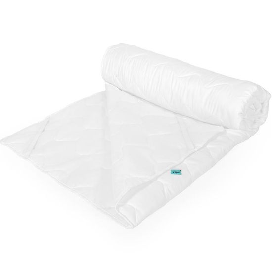Materiał poszycia nakładki to 100% poliester na wierzchu (mikrofibra) o gęstości 68 g/m², co sprawia, że jest ona przyjemna w dotyku i miękka. Spód nakładki wykonany jest z 100% polipropylenu, a jej wykończenie zawiera gumki na narożnikach oraz lamówkę, co pomaga w utrzymaniu nakładki na miejscu bez przesuwania się.