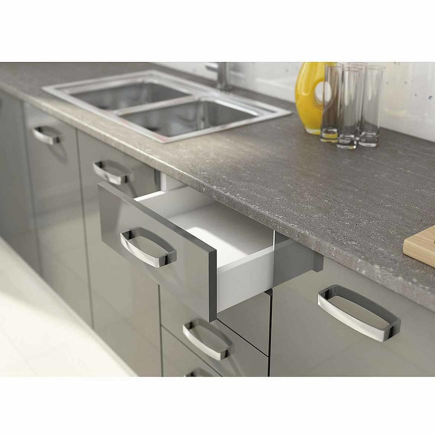 Fronty kuchni wykonane z są z płyty wiórowej laminowanej i prezentują się bardzo elegancko. Szary kolor frontów dodaje kuchni nowoczesnego charakteru, a połyskujące fronty - blasku.