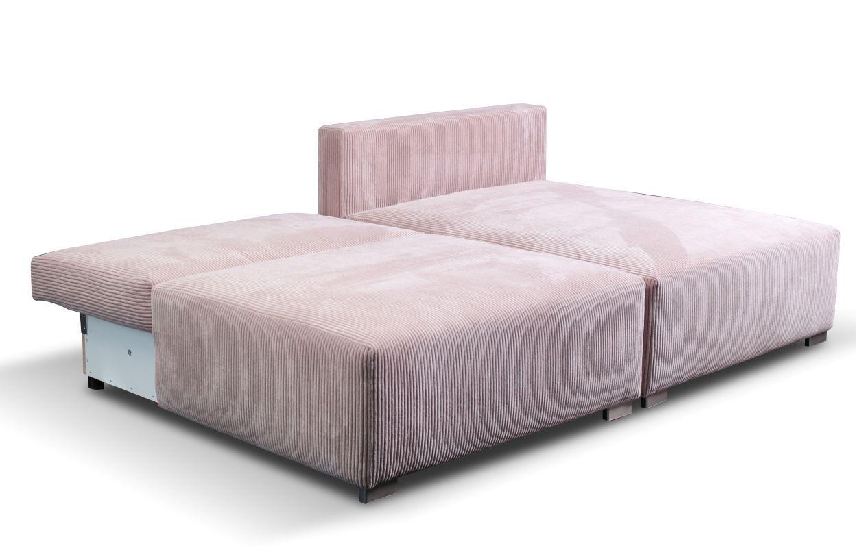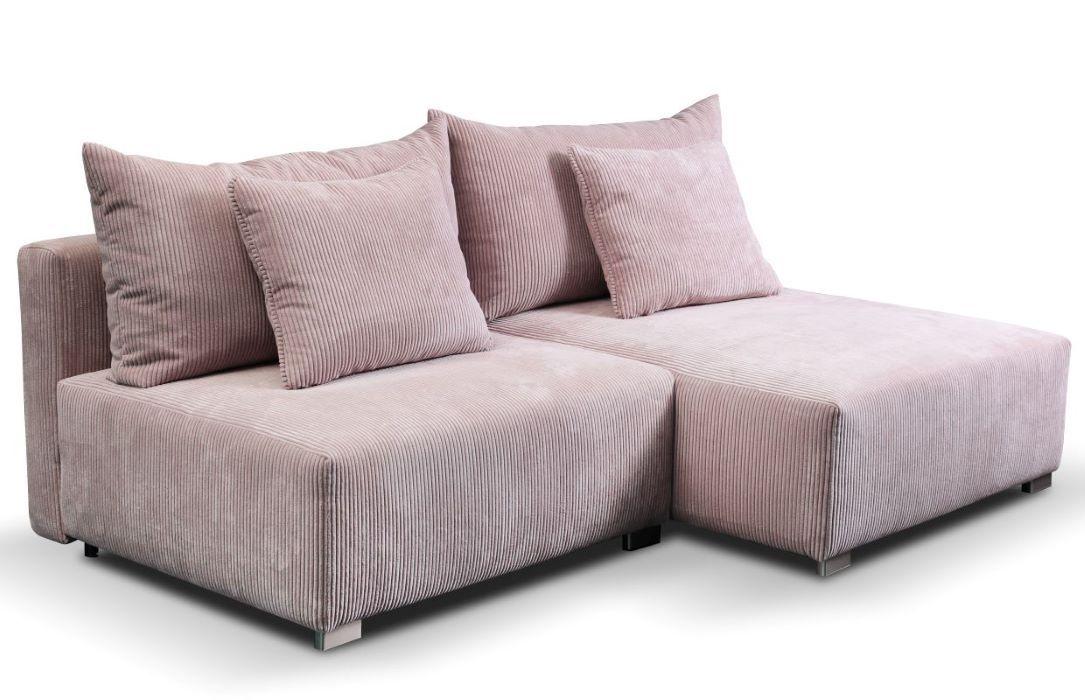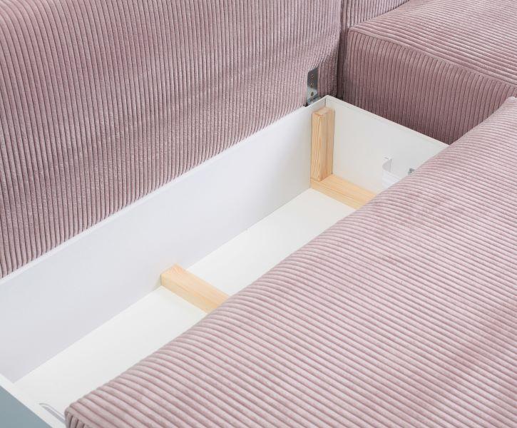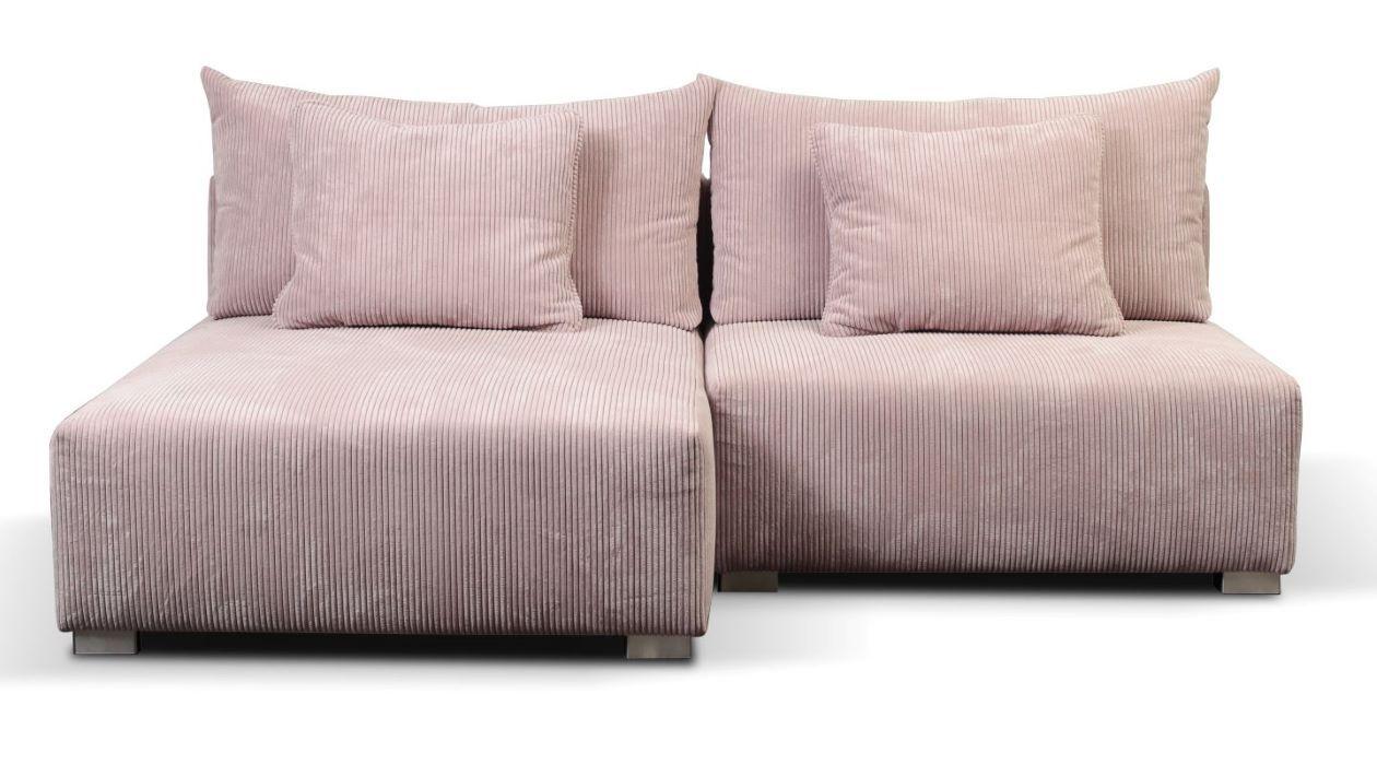 Narożnik Alcamo z funkcją spania typu DL oraz z pojemnikiem na pościel. Po rozłożeniu powierzchnia spania o wymiarach 143x240 cm. W komplecie mebla są 2 duże poduszki oparciowe oraz dwie małe ozdobne. W siedzisku i oparciu mebla zastosowano piankę HR, która znacznie podnosi komfort użytkowania.