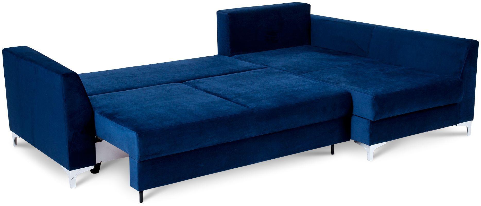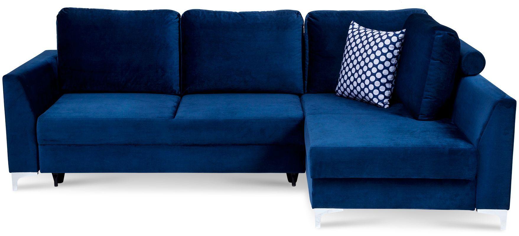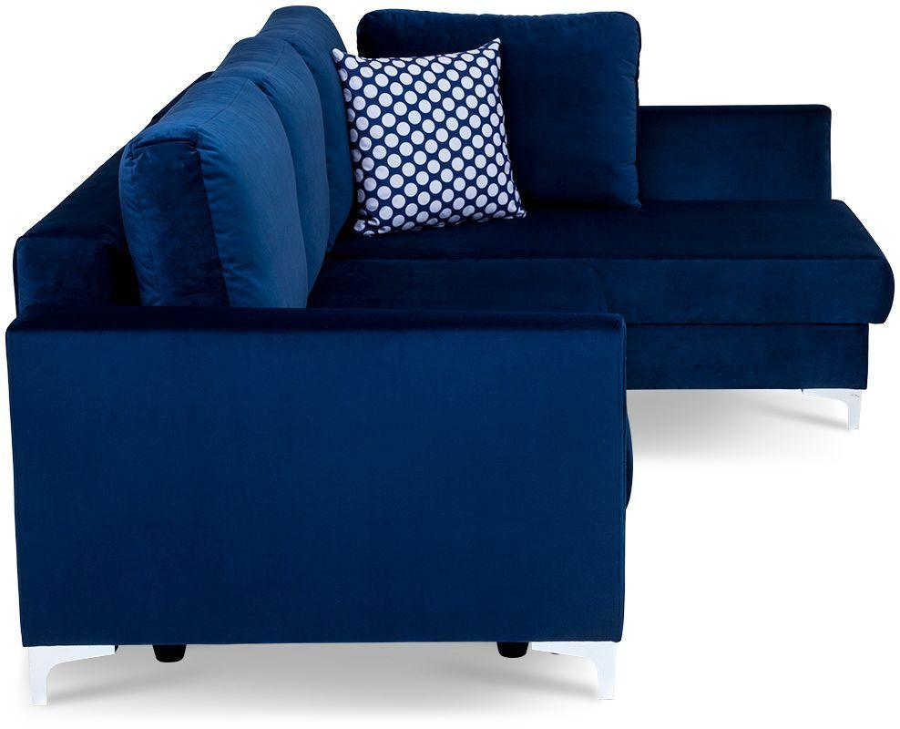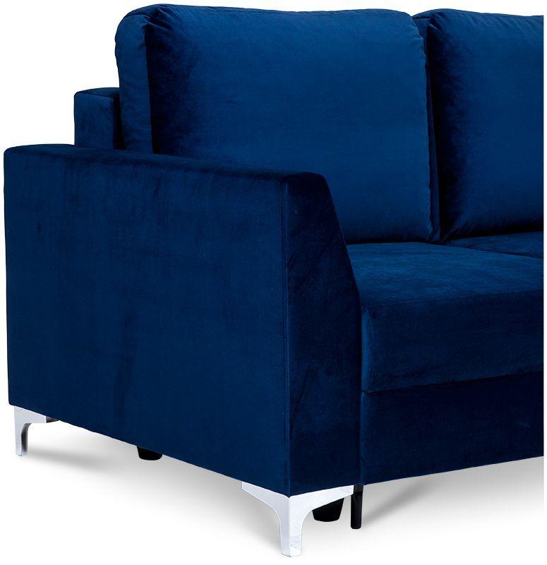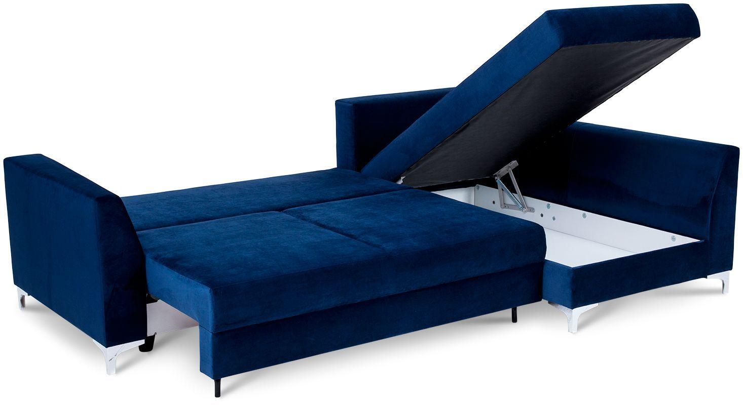 Funkcjonalny narożnik Altea lewy to komfortowy mebel wypoczynkowy. Ta narożnikowa kanapa w głębokim niebieskim odcieniu doskonale wypełni wnętrze salonu i innych stylowo urządzonych pokoi. Jest szczególnie dobrym rozwiązaniem dla rodzin, które cenią sobie wspólny wypoczynek na sofie. Mebel wyposażony został w cztery poduszki oparciowe, które zapewniają odpowiednią pozycję ciała i gwarantują pełen relaks. Dzięki nowoczesnemu sposobowi rozkładania DL i automatowi wspomagającemu rozkładanie, lewy narożnik Altea szybko przekształca się w przestronne i wygodne łóżko. Wysoki komfort spania zapewniają sprężyny faliste, które dostosowują się do kształtu i ciężaru leżącego ciała. Wysokie nóżki tego praktycznego narożnika ułatwiają sprzątanie powierzchni znajdujących się pod nią, a także umożliwiają bezproblemowe przesuwanie mebla.