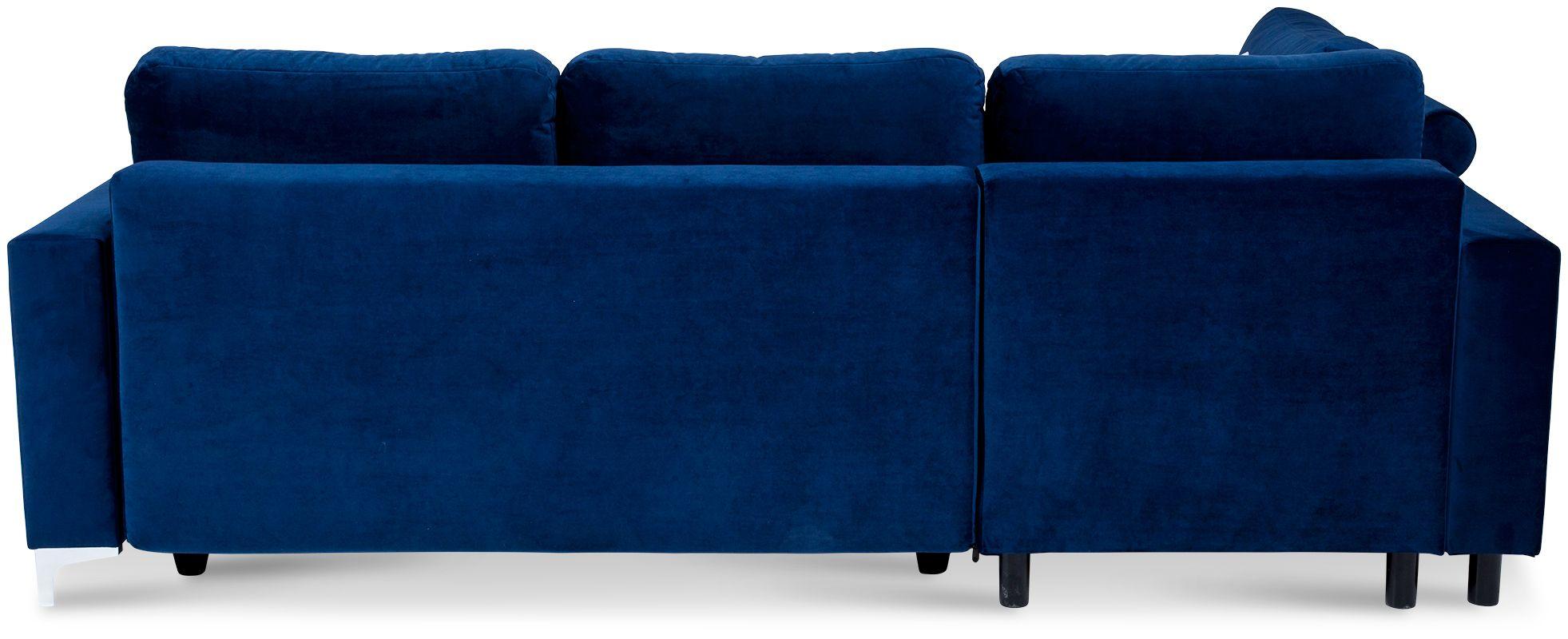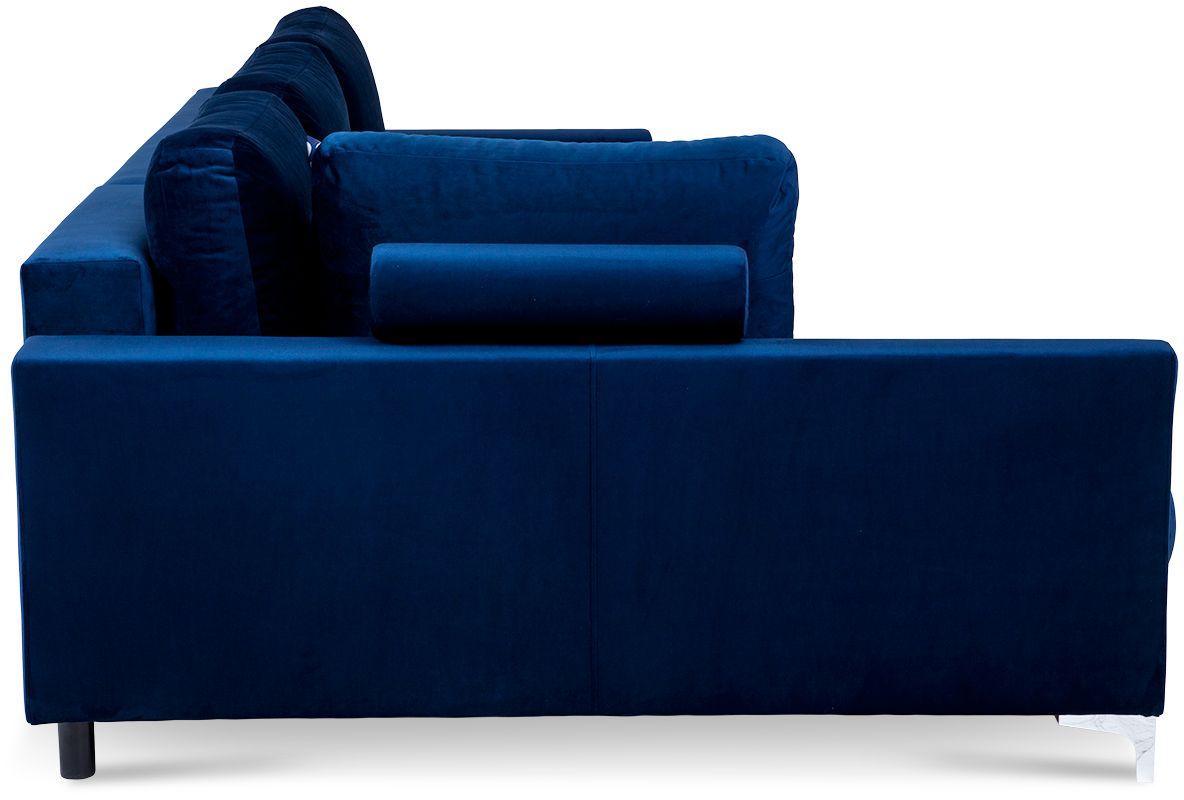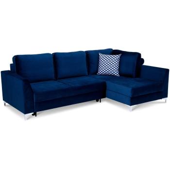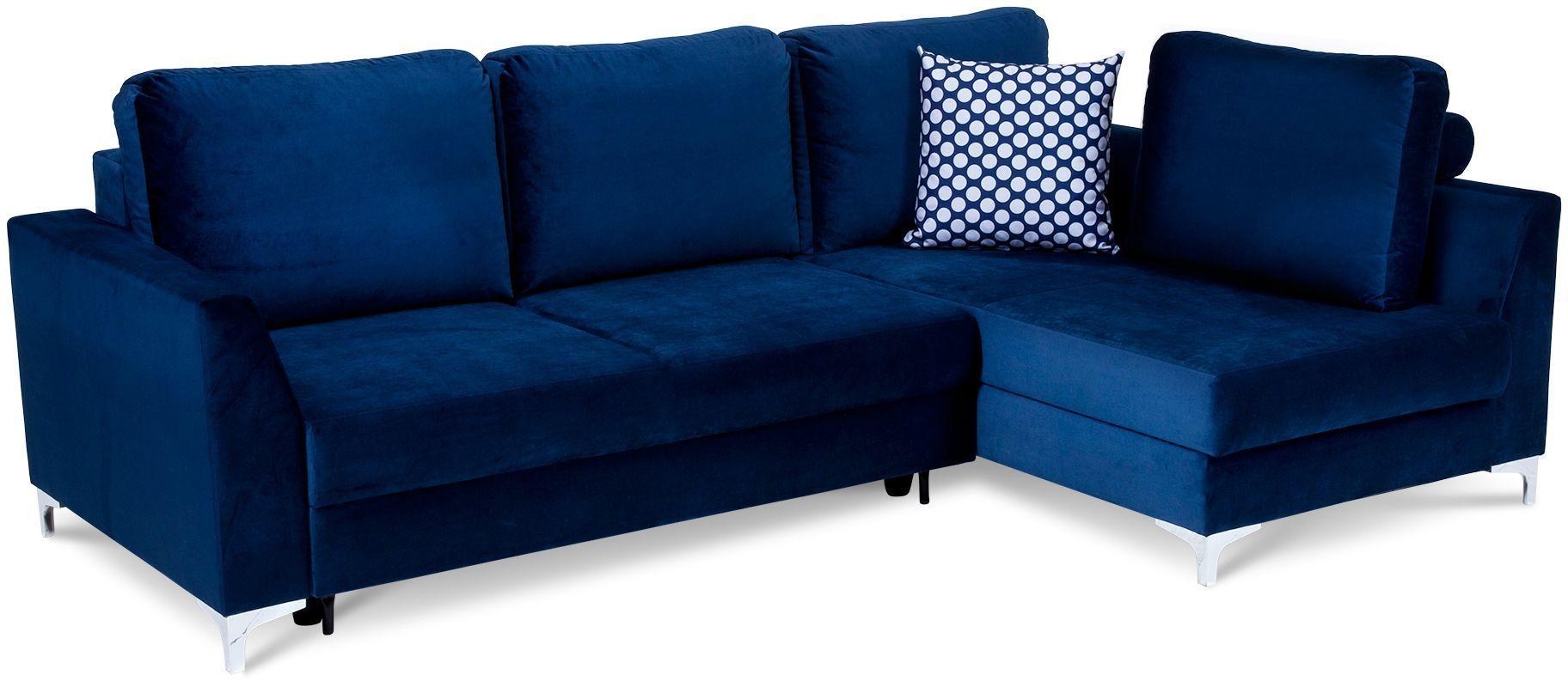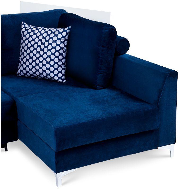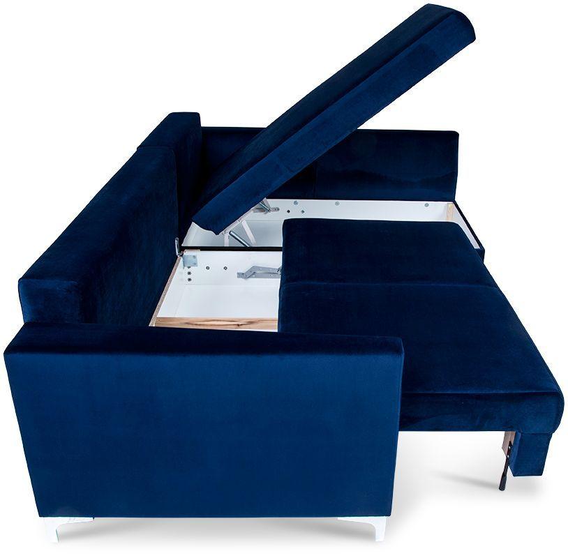 Funkcjonalny narożnik Altea lewy to komfortowy mebel wypoczynkowy. Ta narożnikowa kanapa w głębokim niebieskim odcieniu doskonale wypełni wnętrze salonu i innych stylowo urządzonych pokoi. Jest szczególnie dobrym rozwiązaniem dla rodzin, które cenią sobie wspólny wypoczynek na sofie. Mebel wyposażony został w cztery poduszki oparciowe, które zapewniają odpowiednią pozycję ciała i gwarantują pełen relaks. Dzięki nowoczesnemu sposobowi rozkładania DL i automatowi wspomagającemu rozkładanie, lewy narożnik Altea szybko przekształca się w przestronne i wygodne łóżko. Wysoki komfort spania zapewniają sprężyny faliste, które dostosowują się do kształtu i ciężaru leżącego ciała. Wysokie nóżki tego praktycznego narożnika ułatwiają sprzątanie powierzchni znajdujących się pod nią, a także umożliwiają bezproblemowe przesuwanie mebla.