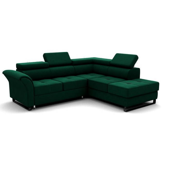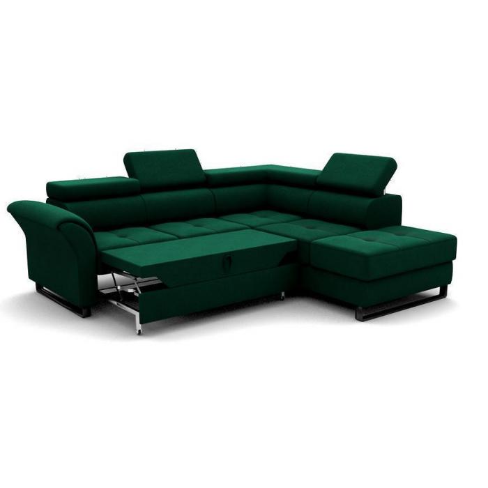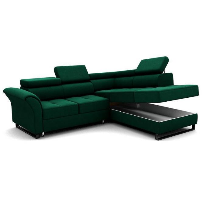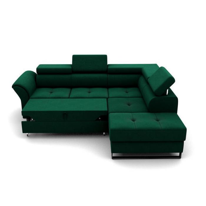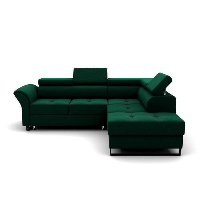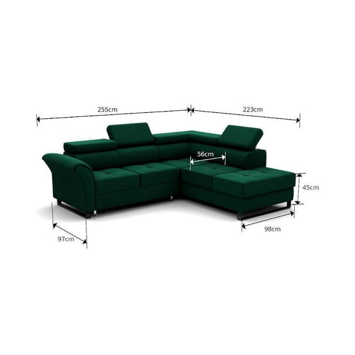 Powierzchnia spania po rozłożeniu wynosi 122x192cm. Dodatkowym udogodnieniem jest pojemnik na pościel - dodatkowe miejsce do przechowywania pozwoli utrzymać codzienny porządek. Zastosowany sposób rozkładania narożnika to delfin - najbardziej praktyczny i łatwy w obsłudze. Narożniki wypoczynkowe z tej serii wypełnione są sprężyną falistą, która dzięki swoim właściwościom zapewnia wysoki komfort codziennego użytkowania. Narożnik posiada dodatkowo lekko profilowane oparcie i ruchome zagłówki, które można wyregulować według potrzeb.