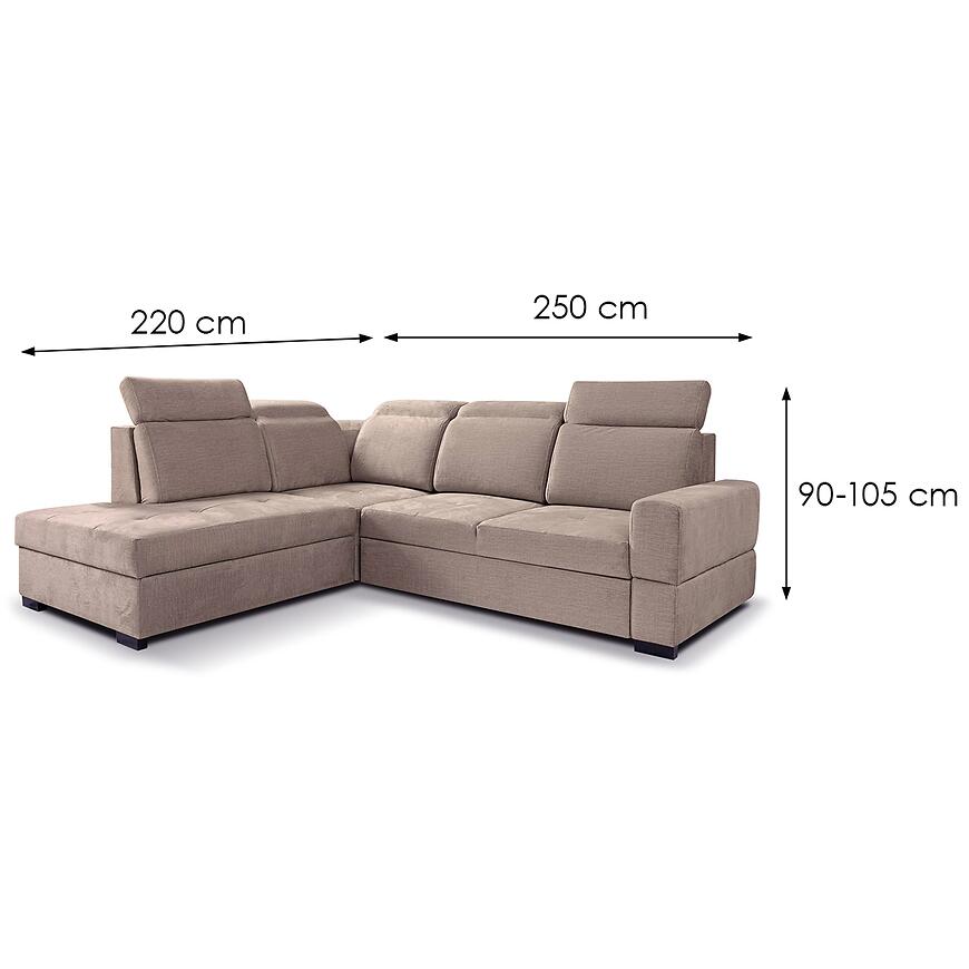 Narożnik Axel L Voss 34 w wersji lewostronnej to elegancki narożnik średniej wielkości w beżowej tkaninie, który łączy nowoczesny design z funkcjonalnością. Wygodne siedzisko ze sprężyną falistą, regulowany zagłówek i praktyczny pojemnik na pościel zapewniają komfort codziennego użytkowania. Funkcja spania o powierzchni 125x180 cm i system rozkładania delfin umożliwiają szybkie przekształcenie narożnika w łóżko. Stabilne czarne nogi podkreślają nowoczesny charakter mebla.