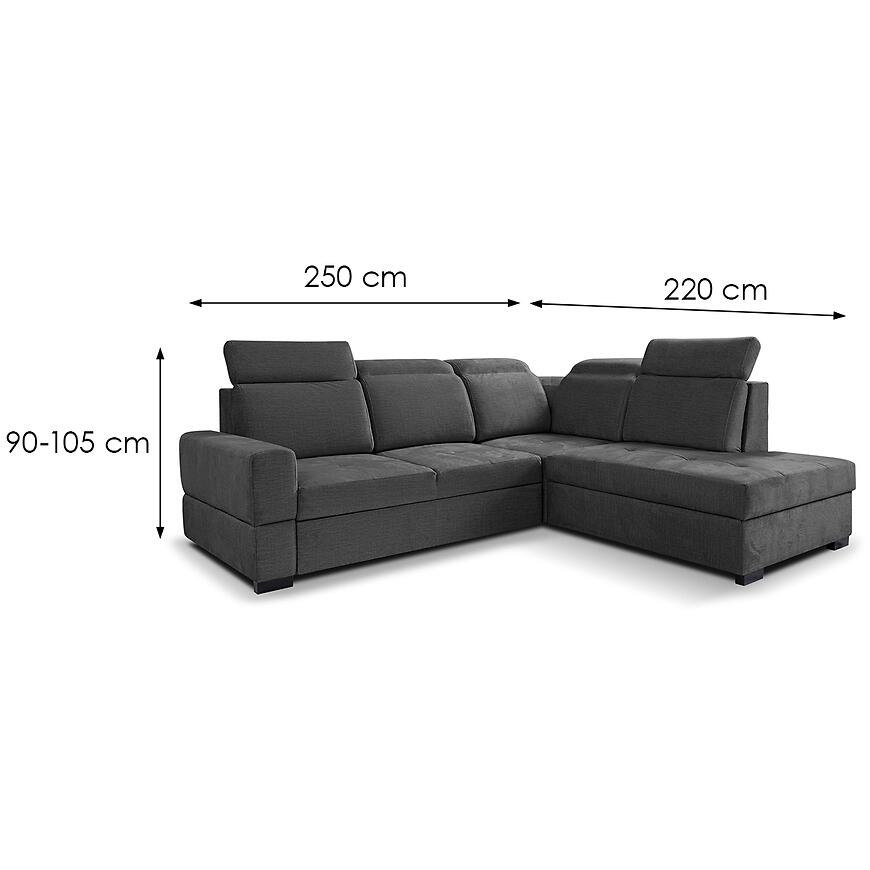 Narożnik Axel L Voss 18 to elegancki i funkcjonalny mebel do salonu o średnich wymiarach. Tapicerowany w szarej tkaninie, z komfortowym siedziskiem na sprężynie falistej i regulowanym zagłówkiem. Posiada funkcję spania o powierzchni 125x180 cm oraz pojemnik na pościel, idealny na codzienne użytkowanie i dla gości. System rozkładania delfin ułatwia obsługę, a prawostronna orientacja i kształt litery L optymalnie wykorzystuje przestrzeń w salonie.