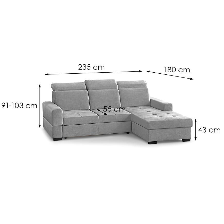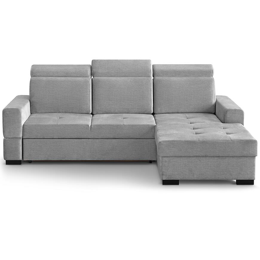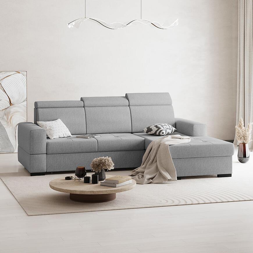Narożnik Axel Mini Voss 07 to kompaktowy i funkcjonalny mebel do salonu, idealny do mniejszych wnętrz. Tapicerowany w szarej tkaninie, posiada komfortowe siedzisko na sprężynie falistej oraz regulowany zagłówek dla większego komfortu. Wyposażony w funkcję spania o powierzchni 128x180 cm oraz pojemnik na pościel, sprawdzi się na co dzień i dla gości. System rozkładania delfin ułatwia obsługę, a prawostronna orientacja i kształt litery L pozwala optymalnie zagospodarować przestrzeń.
