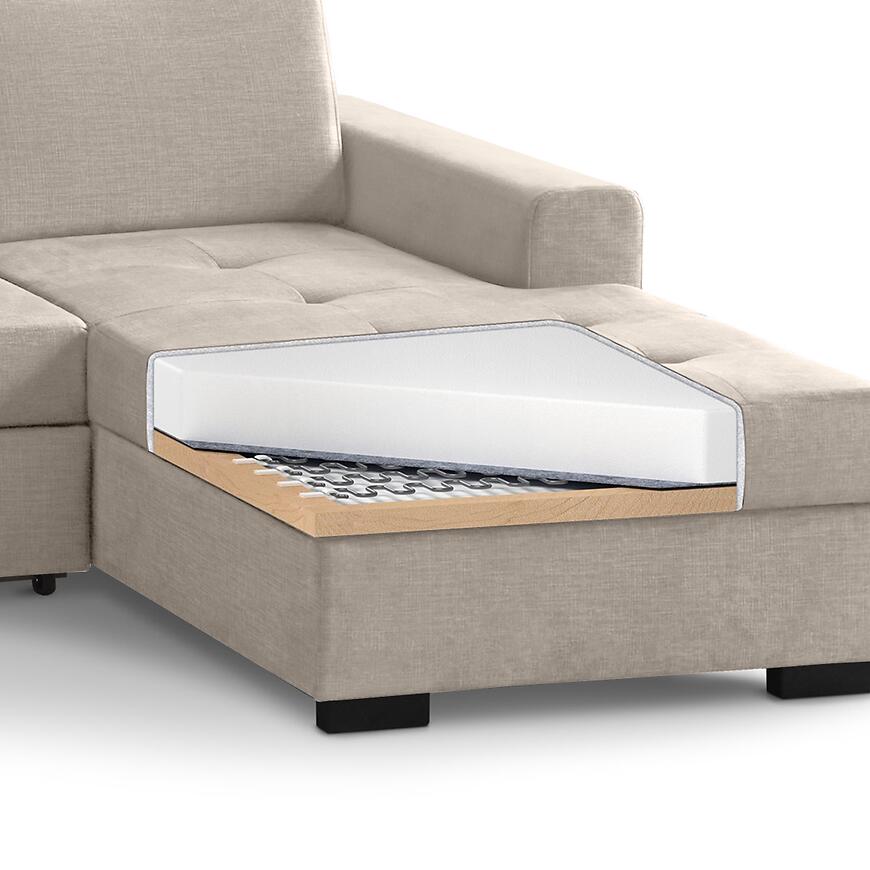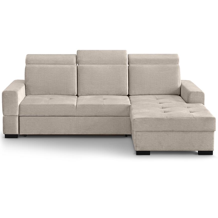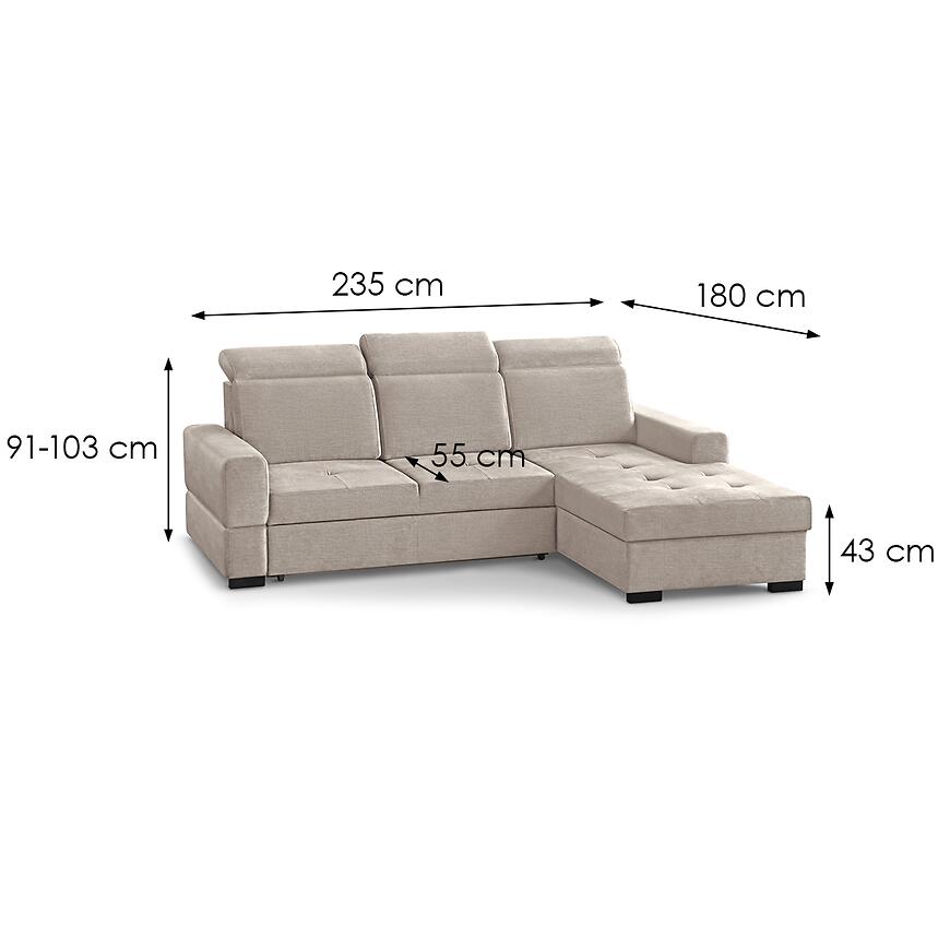 Narożnik Axel Mini Voss 28 to kompaktowy i funkcjonalny mebel do salonu, idealny do mniejszych wnętrz. Tapicerowany w beżowej tkaninie, posiada wygodne siedzisko na sprężynie falistej i regulowany zagłówek dla większego komfortu. Wyposażony w funkcję spania o powierzchni 140x215 cm oraz pojemnik na pościel, sprawdzi się na co dzień i dla gości. System rozkładania delfin ułatwia obsługę, a prawostronna orientacja i kształt litery L pozwala optymalnie zagospodarować przestrzeń.