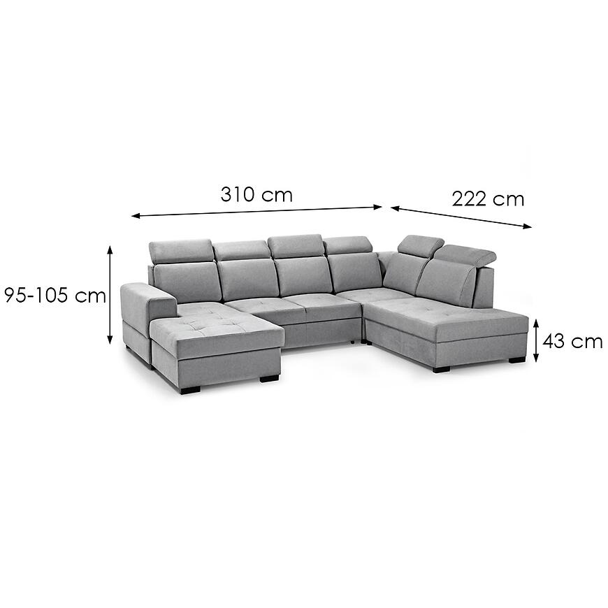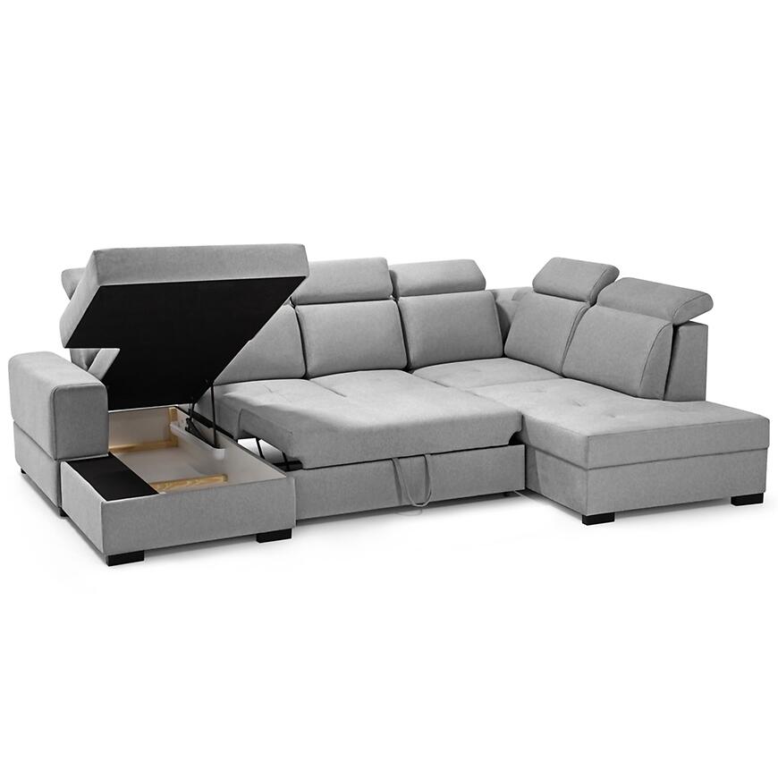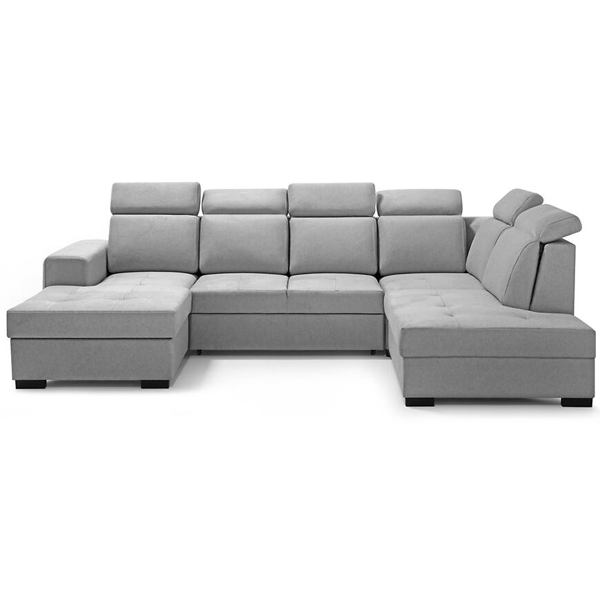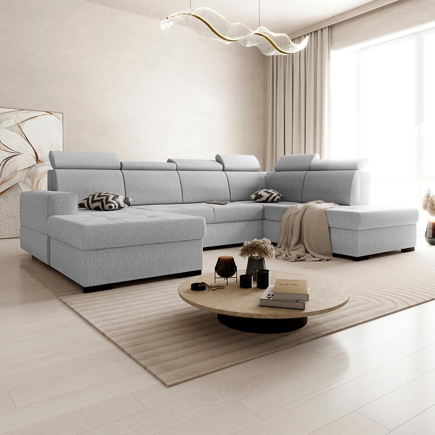 Narożnik Axel U Voss 07 to przestronny i elegancki mebel do salonu, idealny do dużych wnętrz. Tapicerowany w szarej tkaninie, zapewnia komfort dzięki sprężynie falistej w siedzisku oraz regulowanym zagłówkom. Wyposażony w funkcję spania o powierzchni 125x235 cm i pojemnik na pościel, sprawdzi się na co dzień i dla gości. System rozkładania delfin ułatwia użytkowanie, a kształt litery U i lewostronna orientacja pozwala optymalnie zagospodarować przestrzeń w salonie.