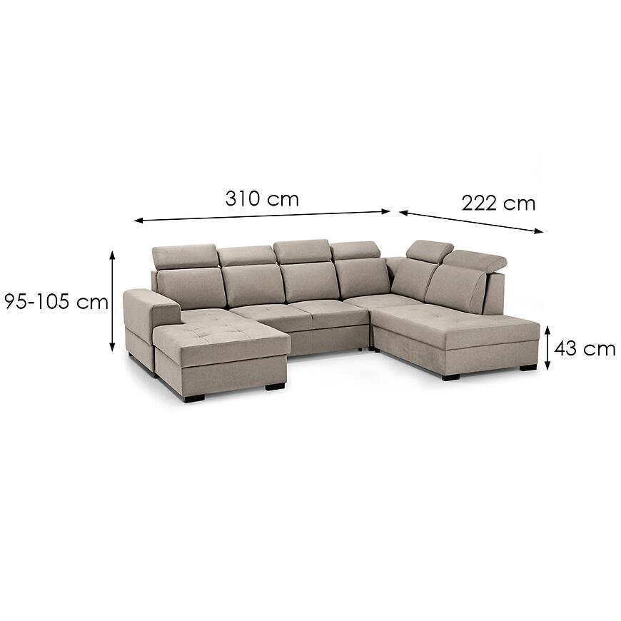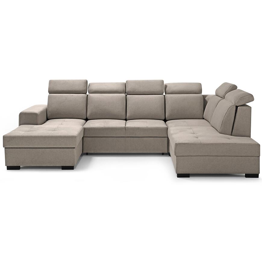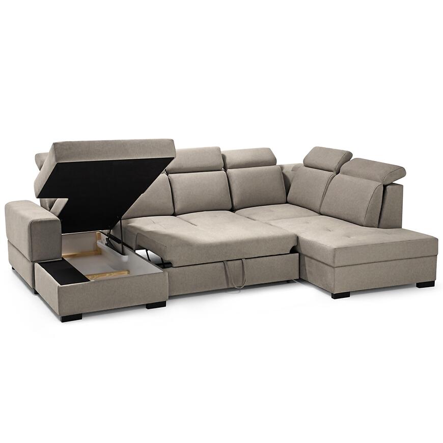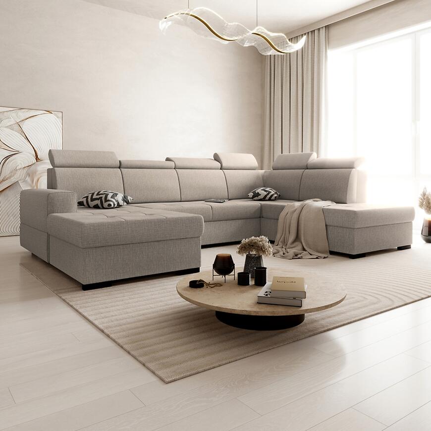 Narożnik Axel U Voss 34 to przestronny i elegancki mebel do salonu, idealny do dużych wnętrz. Tapicerowany w beżowej tkaninie, zapewnia wygodę dzięki sprężynie falistej w siedzisku oraz regulowanym zagłówkom. Wyposażony w funkcję spania o powierzchni 125x235 cm i pojemnik na pościel, sprawdzi się na co dzień i dla gości. System rozkładania delfin ułatwia użytkowanie, a kształt litery U i lewostronna orientacja pozwala wygodnie zagospodarować przestrzeń w salonie.