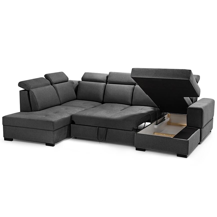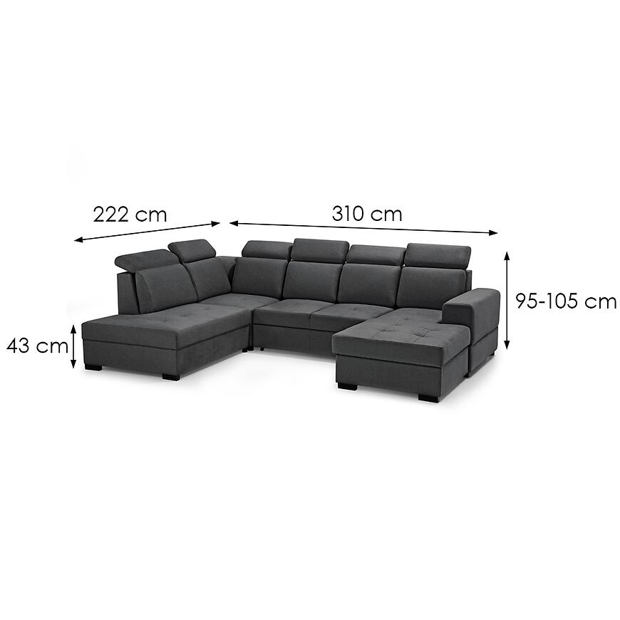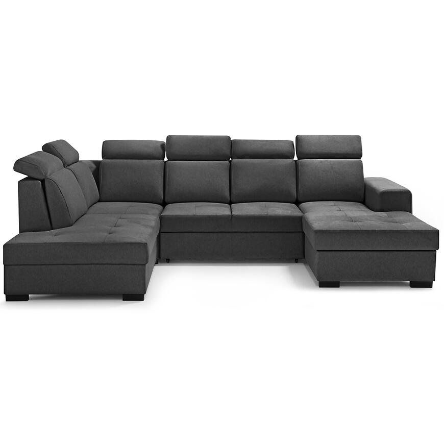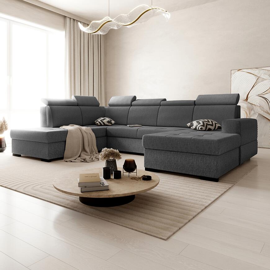 Narożnik Axel U Voss 18 to nowoczesny i przestronny mebel do salonu, idealny do dużych wnętrz. Tapicerowany w szarej tkaninie, oferuje wygodę dzięki sprężynie falistej w siedzisku i regulowanym zagłówkom. Wyposażony w funkcję spania o powierzchni 125x235 cm oraz pojemnik na pościel, sprawdzi się zarówno na co dzień, jak i dla gości. System rozkładania delfin ułatwia użytkowanie, a kształt litery U i prawostronna orientacja pozwala optymalnie zagospodarować przestrzeń w salonie.