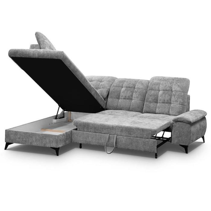 Narożnik Betty z funkcją spania został pokryty tkaniną. Prostotę i łatwość użytkowania gwarantuje system rozkładania typu delfin. Jest to szybki, prosty i wygodny sposób rozkładania. Jest jednym z najbardziej popularnych systemów rozkładania, który jest wykorzystywany w narożnikach. Po rozłożeniu to okazjonalne miejsce do spania o wymiarach 120x184 cm. Mebel posiada pojemnik, do którego można schować pościel, dodatkowe koce czy też poduszki. W siedzisku zastosowano sprężynę falistą, która dostosowuje się do ciężaru i kształtu ciała, zapewniając tym samym wysoki komfort siedzenia. Ten niepowtarzalny mebel wypoczynkowy stworzono z myślą o funkcjonalności i eleganckim wyglądzie. Narożnik dostępny w wersji prawostronnej i lewostronnej.
