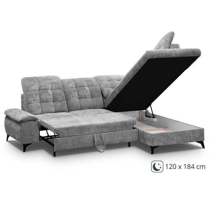 Narożnik Betty z funkcją spania został pokryty tkaniną. Prostotę i łatwość użytkowania gwarantuje system rozkładania typu delfin. Jest to szybki, prosty i wygodny sposób rozkładania. Jest jednym z najbardziej popularnych systemów rozkładania, który jest wykorzystywany w narożnikach. Po rozłożeniu to okazjonalne miejsce do spania o wymiarach 120x184 cm. Mebel posiada pojemnik, do którego można schować pościel, dodatkowe koce czy też poduszki. W siedzisku zastosowano sprężynę falistą, która dostosowuje się do ciężaru i kształtu ciała, zapewniając tym samym wysoki komfort siedzenia. Ten niepowtarzalny mebel wypoczynkowy stworzono z myślą o funkcjonalności i eleganckim wyglądzie. Narożnik dostępny w wersji prawostronnej i lewostronnej.