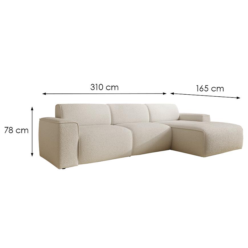 Model ten mierzy 310 cm szerokości, 165 cm głębokości i 78 cm wysokości, oferując przestronne i komfortowe miejsce do siedzenia. Siedzisko wypełnione sprężyną falistą, pianką T30 i warstwą owaty gwarantuje odpowiednią sprężystość i wygodę, natomiast elastyczne pasy w oparciu wspierają trwałość konstrukcji i komfort codziennego użytkowania.