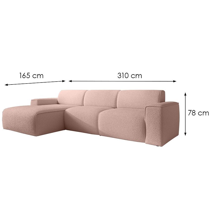 Narożnik Pado Now or Never 61 w wersji lewej to nowoczesny, duży mebel wypoczynkowy, który przyciąga uwagę subtelnym różowym kolorem i elegancką formą. Jego szerokość 310 cm, głębokość 165 cm oraz wysokość 78 cm sprawiają, że idealnie sprawdzi się w przestronnych wnętrzach, zapewniając komfortową przestrzeń do codziennego relaksu.