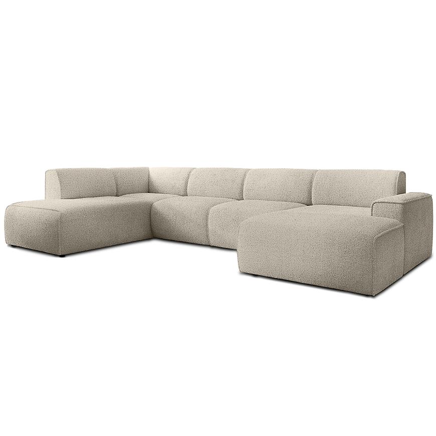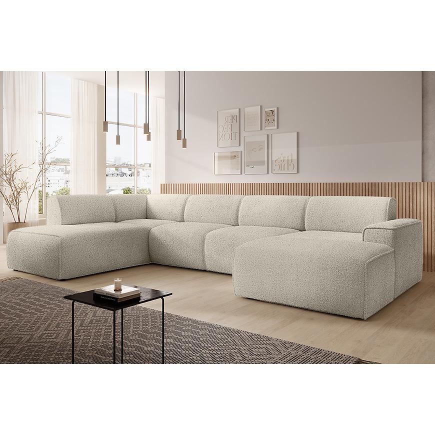 Beżowa tapicerka z tkaniny w połączeniu z eleganckim kształtem litery U nadaje wnętrzu przytulny i nowoczesny charakter. Lewostronna orientacja narożnika pozwala dopasować go do konkretnego układu pomieszczenia.