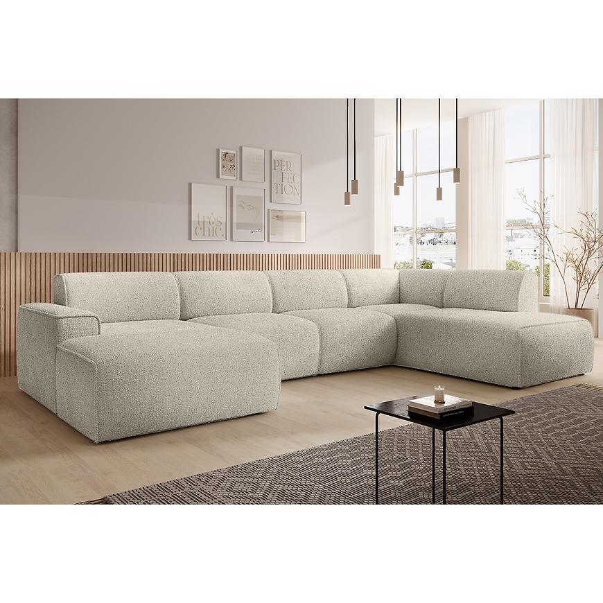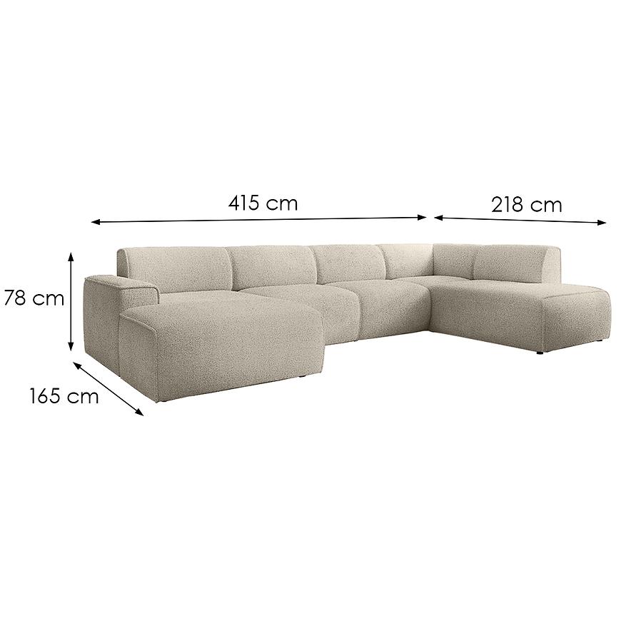 Narożnik bez funkcji spania Pado U Now or Never 03 w wersji prawej to bardzo duży mebel, idealny do przestronnych salonów. Jego szerokość wynosi 415 cm, a głębokość 165/218 cm, co zapewnia dużo miejsca do wygodnego wypoczynku. Tapicerka wykonana jest z wysokiej jakości tkaniny w uniwersalnym, beżowym kolorze, który doskonale wpisuje się w różne style wnętrz.