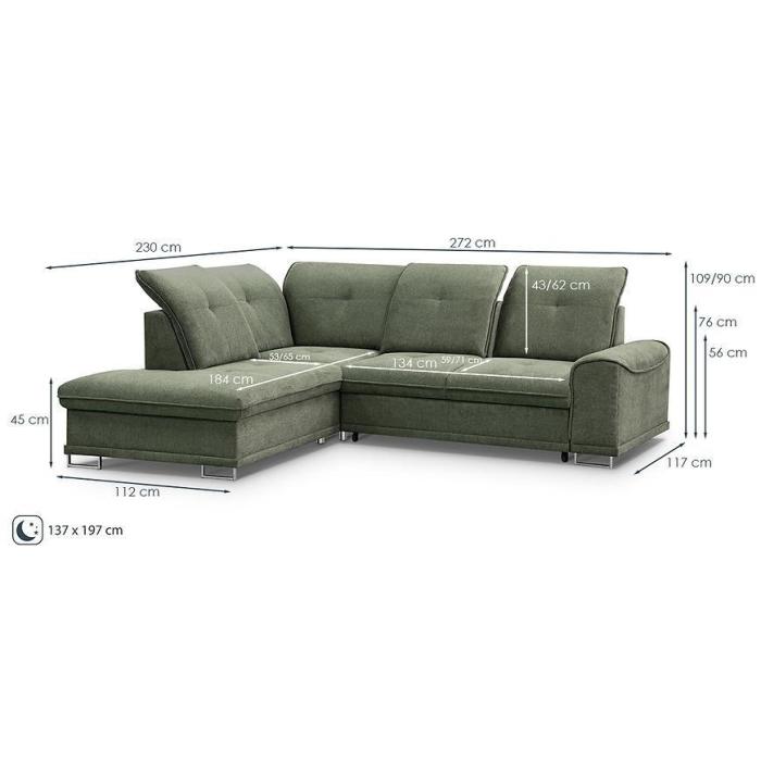 Sposób rozkładania delfin pomaga szybko i bezproblemowo przekształcić kanapę w przestronne łóżko z funkcją spania. Rozkładanie tego typu jest często spotykane w narożnikach. Po rozłożeniu to okazjonalne miejsce do spania o wymiarach 137x197cm, a pościel można schować do pojemnika umieszczonego pod siedziskiem zapewniając ład i porządek w pomieszczeniu.