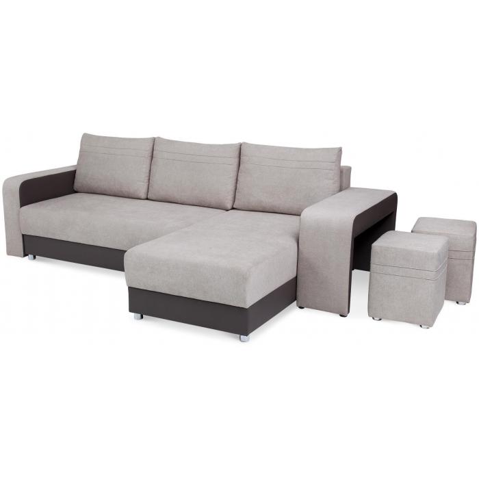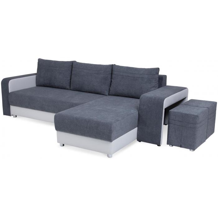 Kanapa narożna Bueno w kształcie litery L dostępna jest i w wersji uniwersalnej – prawej lub lewej – to idealne rozwiązanie dla przestrzeni, użytkowanych przez wielu domowników. Dołączone w zestawie dwie pufy zapewniają możliwość wygodnego relaksu dla całej rodziny. Narożnik posiada niskie, srebrne nóżki, które wraz z ozdobnymi przeszyciami na poduszkach i pufach nieco urozmaicają jego stylistykę. Tapicerowany wysokojakościową tkaniną w połączeniu z ekoskórą prezentuje się niebanalnie i elegancko.