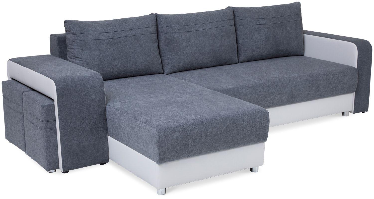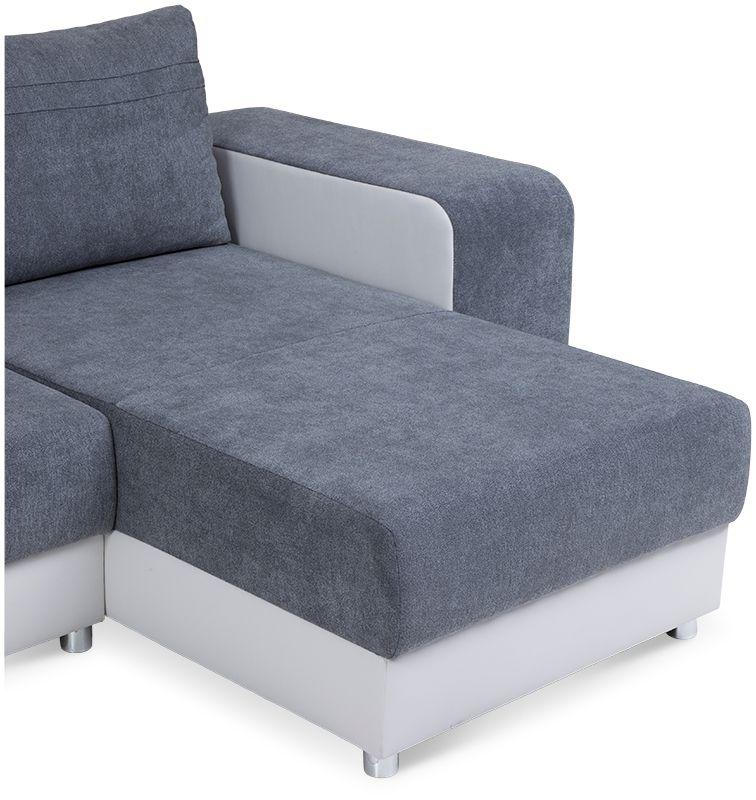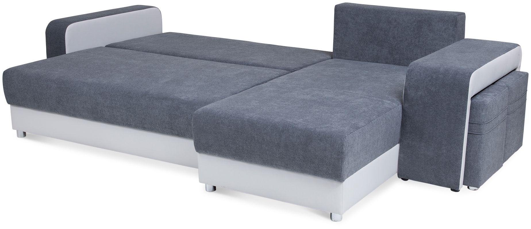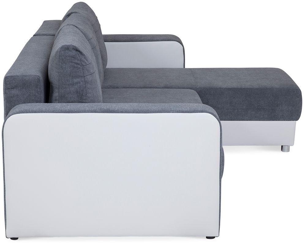 Narożnik Bueno prawy z pufami to kanapa o klasycznym designie, która sprawdzi się zarówno w salonie, jak i pokoju nastolatka. Połączenie siedziska w odcieniu popielu oraz elementów podstawy z ekoskóry w kolorze białym jest przykładem doskonałego uzupełniania się dwóch różnych faktur. Poduszki zostały przeszyte ozdobnymi nićmi, które zachwycają minimalizmem. Mebel został wyposażony również w dwa podłokietniki. W jednym z nich ukryto dwie subtelne pufy, które stanowią dwa dodatkowe siedziska. Konstrukcję narożnika z przeszyciami oparto na plastikowych nóżkach z efektem chromowanego połysku, które komponują się perfekcyjnie, tworząc zarazem doskonały efekt wizualny. Prawy narożnik Bueno z pufami jest również gwarancją komfortu i funkcjonalności. Technologia produkcji tej kanapy została oparta na sprężynach falistych, które zapewniają możliwość wielogodzinnego użytkowania z poczuciem nietuzinkowej wygody.