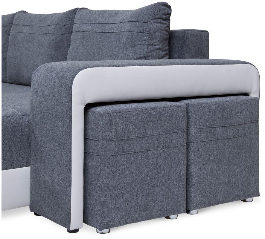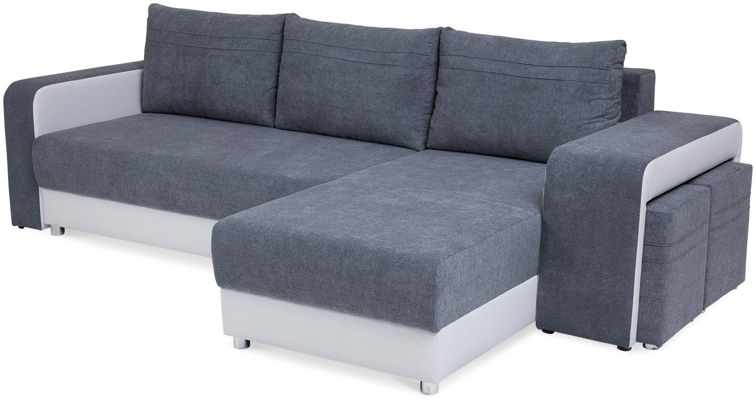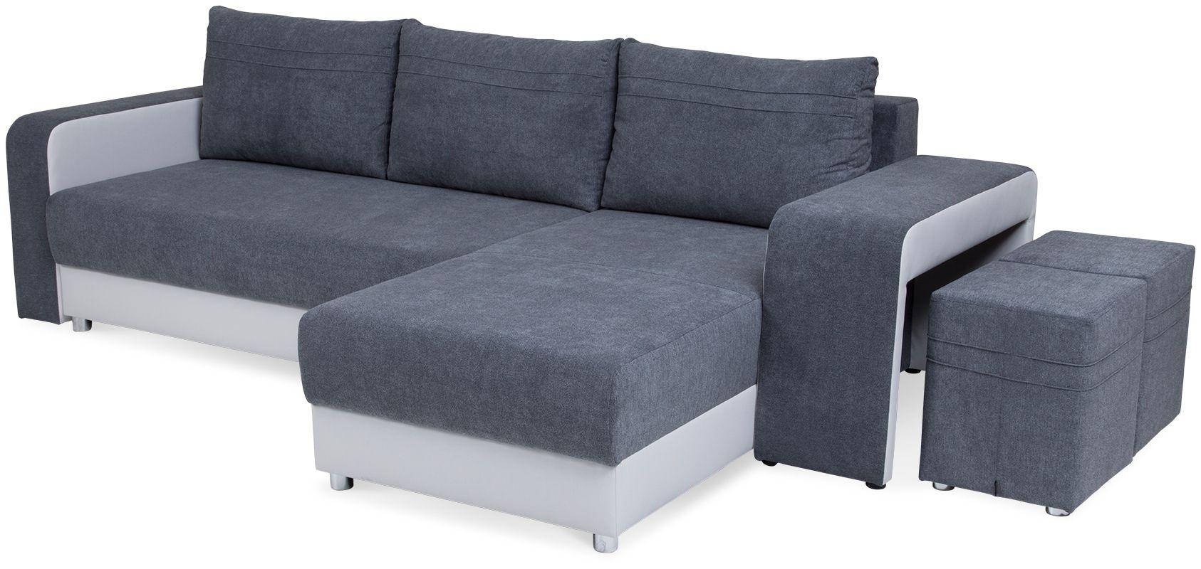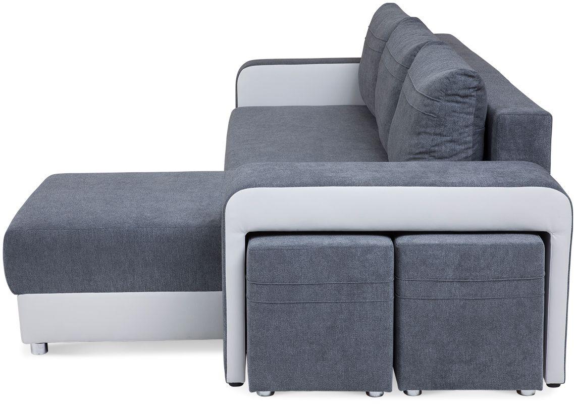 Narożnik Bueno prawy z pufami to kanapa o klasycznym designie, która sprawdzi się zarówno w salonie, jak i pokoju nastolatka. Połączenie siedziska w odcieniu popielu oraz elementów podstawy z ekoskóry w kolorze białym jest przykładem doskonałego uzupełniania się dwóch różnych faktur. Poduszki zostały przeszyte ozdobnymi nićmi, które zachwycają minimalizmem. Mebel został wyposażony również w dwa podłokietniki. W jednym z nich ukryto dwie subtelne pufy, które stanowią dwa dodatkowe siedziska. Konstrukcję narożnika z przeszyciami oparto na plastikowych nóżkach z efektem chromowanego połysku, które komponują się perfekcyjnie, tworząc zarazem doskonały efekt wizualny. Prawy narożnik Bueno z pufami jest również gwarancją komfortu i funkcjonalności. Technologia produkcji tej kanapy została oparta na sprężynach falistych, które zapewniają możliwość wielogodzinnego użytkowania z poczuciem nietuzinkowej wygody.