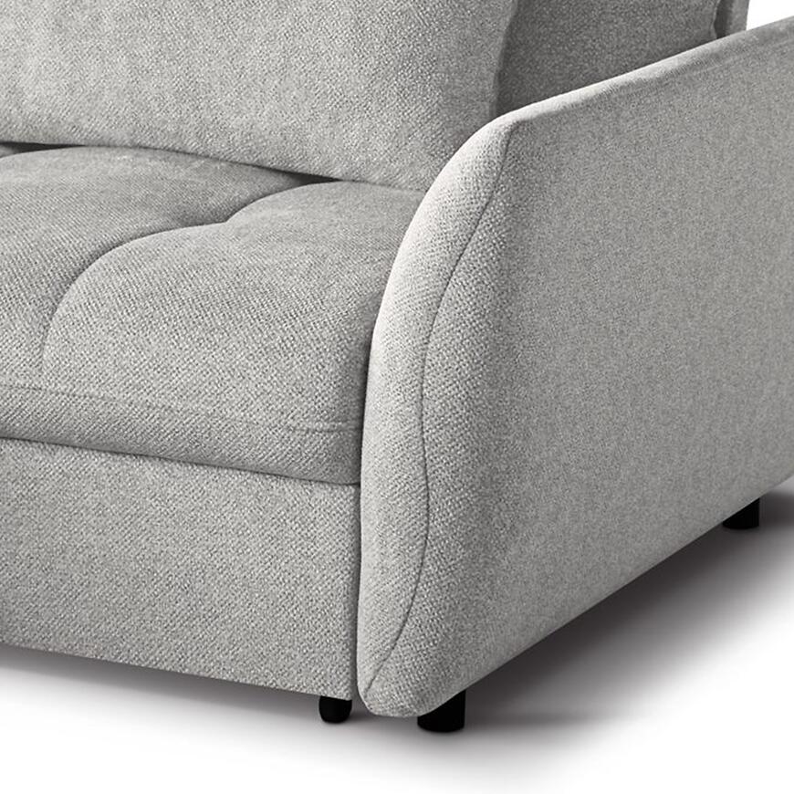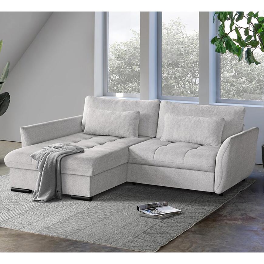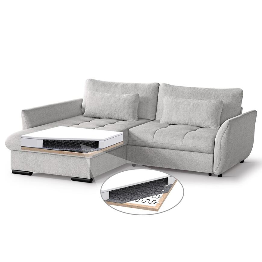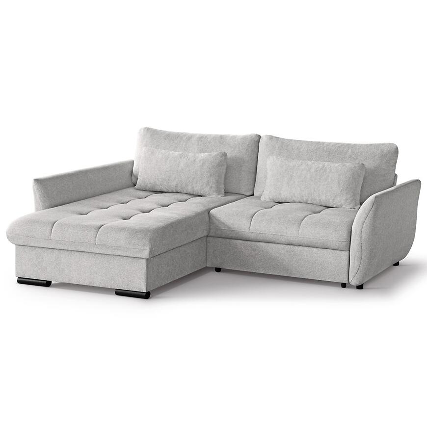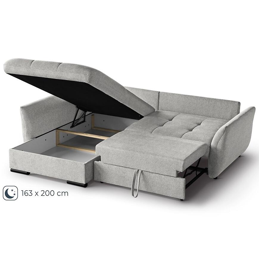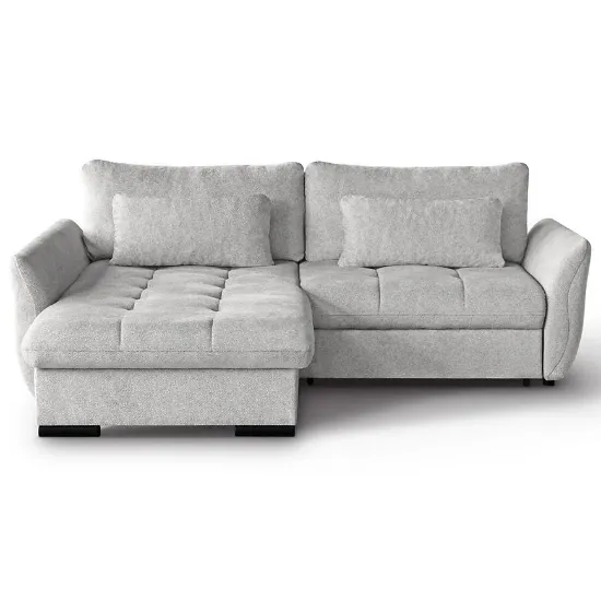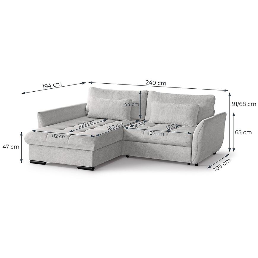 Narożnik Cafu L Louis 661 w kremowym kolorze to nowoczesny narożnik w kształcie litery L o orientacji lewostronnej, o wymiarach 240x194 cm. Posiada funkcję spania z powierzchnią 200x163 cm oraz mechanizm rozkładania typu „delfin” z automatem do rozkładania. Siedzisko wypełnione jest sprężyną bonell i sprężyną falistą, a jego wysokość wynosi 47 cm, a głębokość 70 cm. Narożnik wyposażony jest w jeden pojemnik na pościel, stoi na czarnych nogach, ma ozdobne przeszycia oraz w zestawie poduszki. Wymaga montażu, nie zawiera pufy, a zagłówki i podłokietniki nie są regulowane.