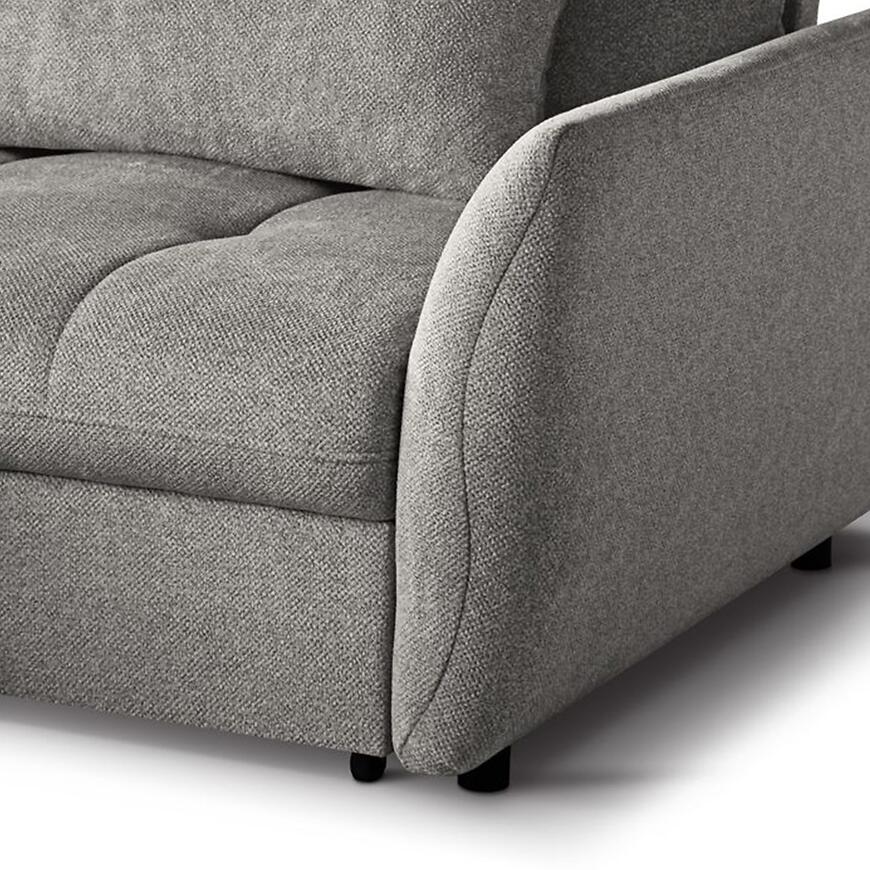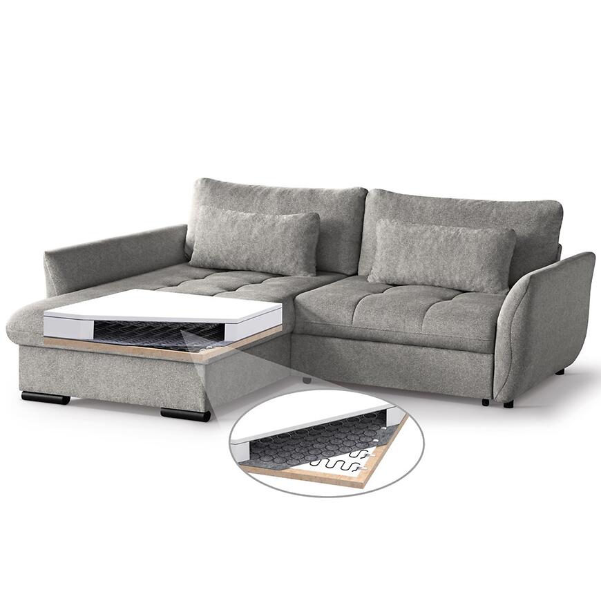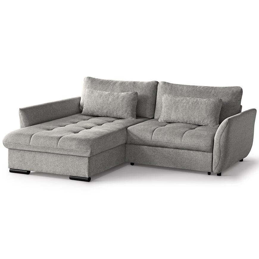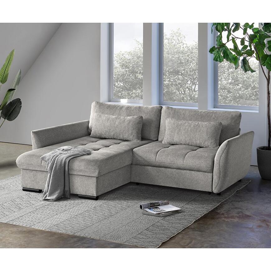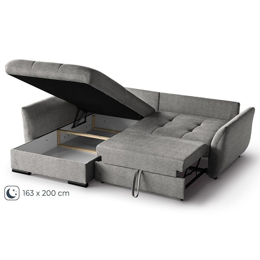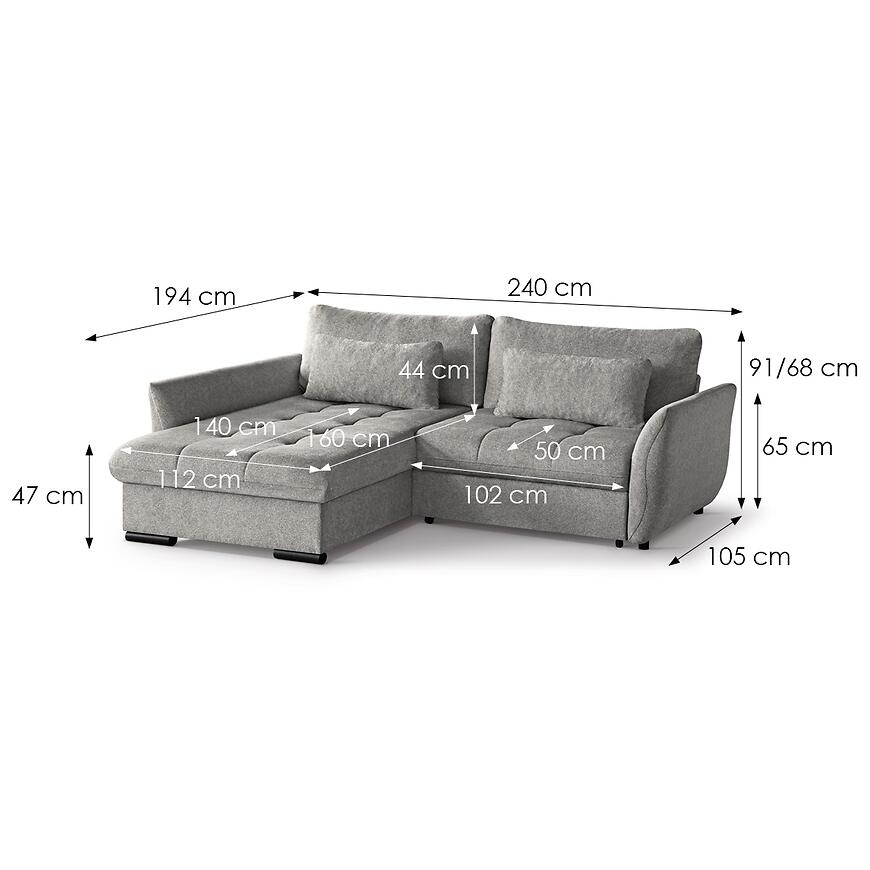 Narożnik Cafu L Louis 664 w brązowym kolorze to nowoczesny narożnik lewostronny w kształcie litery L o wymiarach 240x194 cm. Wyposażony jest w funkcję spania z powierzchnią 200x163 cm oraz mechanizm rozkładania typu „delfin” z automatem do rozkładania. Siedzisko wypełnione jest sprężyną bonell oraz sprężyną falistą, ma wysokość 47 cm i głębokość 70 cm. Narożnik posiada jeden pojemnik na pościel, stoi na czarnych nogach, ma ozdobne przeszycia i w zestawie poduszki. Wymaga montażu, nie zawiera pufy, a zagłówki, podłokietniki i oparcie nie są regulowane.