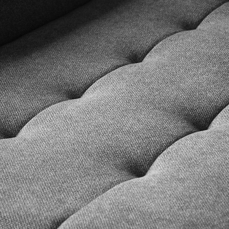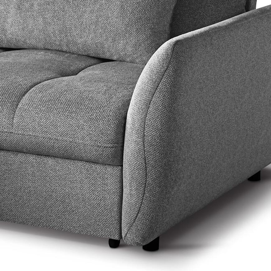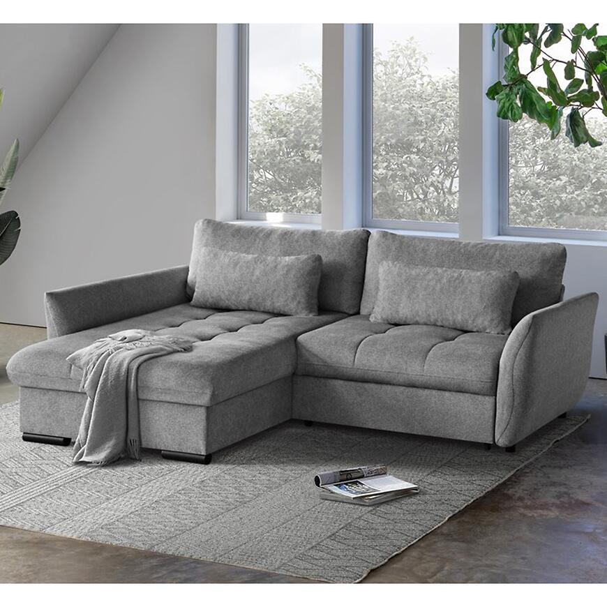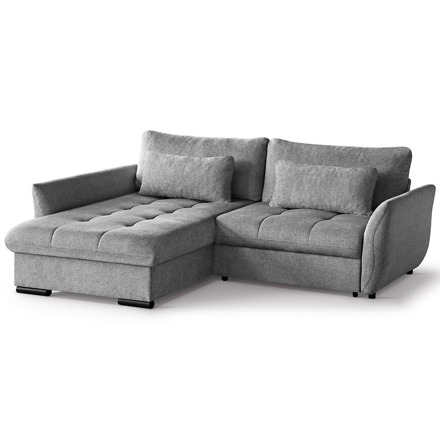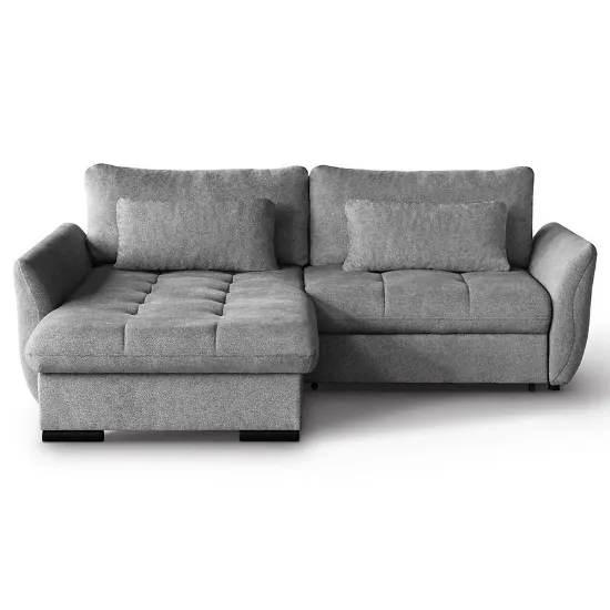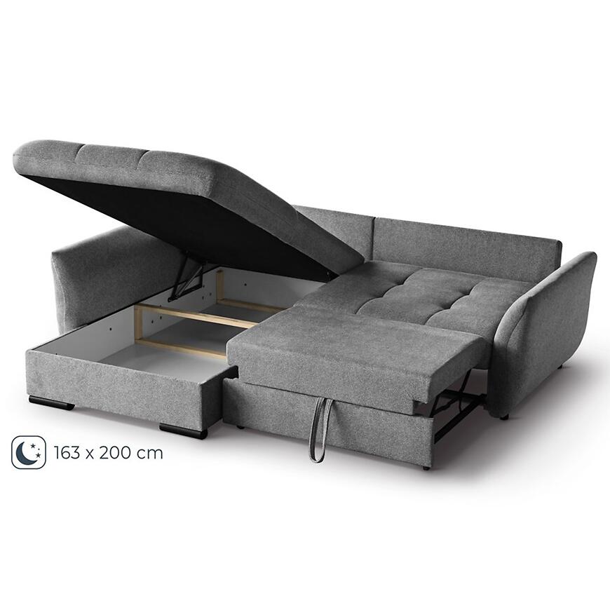 Narożnik Cafu L Louis 668 w szarym kolorze to nowoczesny narożnik lewostronny w kształcie litery L o wymiarach 240x194 cm. Wyposażony jest w funkcję spania z powierzchnią 200x163 cm oraz mechanizm rozkładania typu „delfin” z automatem do rozkładania. Siedzisko wypełnione jest sprężyną bonell i sprężyną falistą, jego wysokość wynosi 47 cm, a głębokość 70 cm. Narożnik posiada jeden pojemnik na pościel, stoi na czarnych nogach, a jego ozdobą są przeszycia. W zestawie znajdują się poduszki, natomiast zagłówki, podłokietniki i oparcie nie są regulowane. Mebel wymaga montażu i nie zawiera pufy.