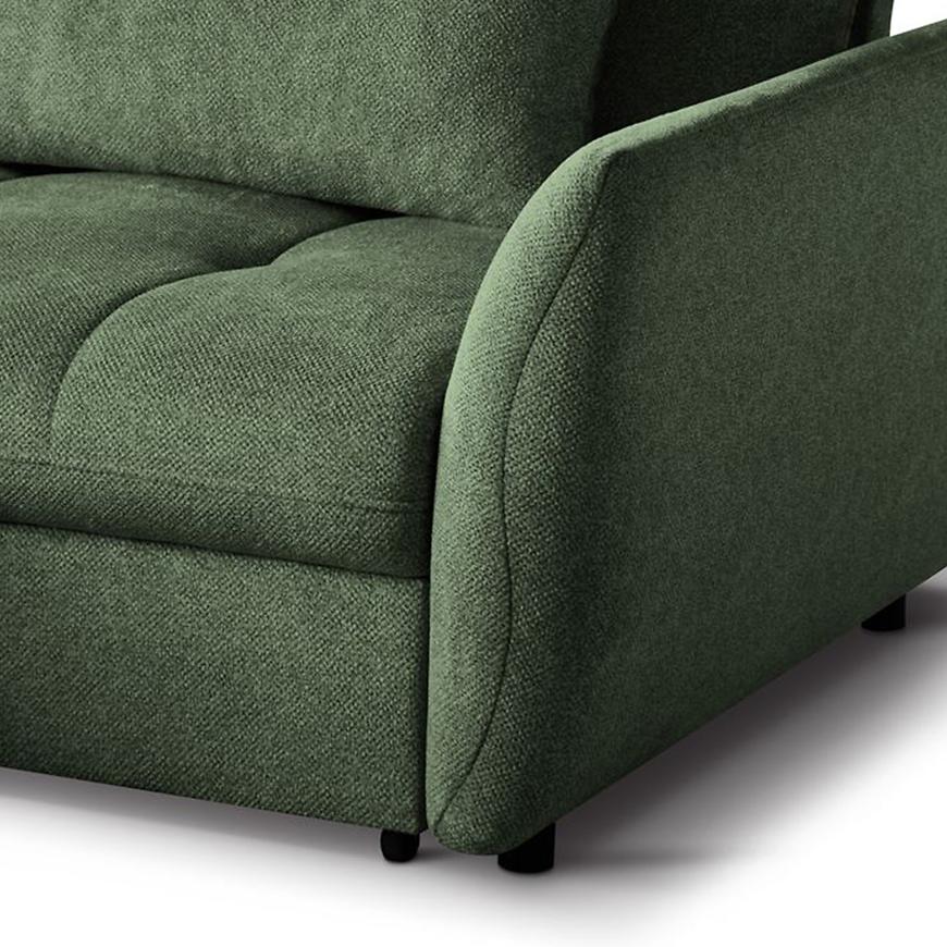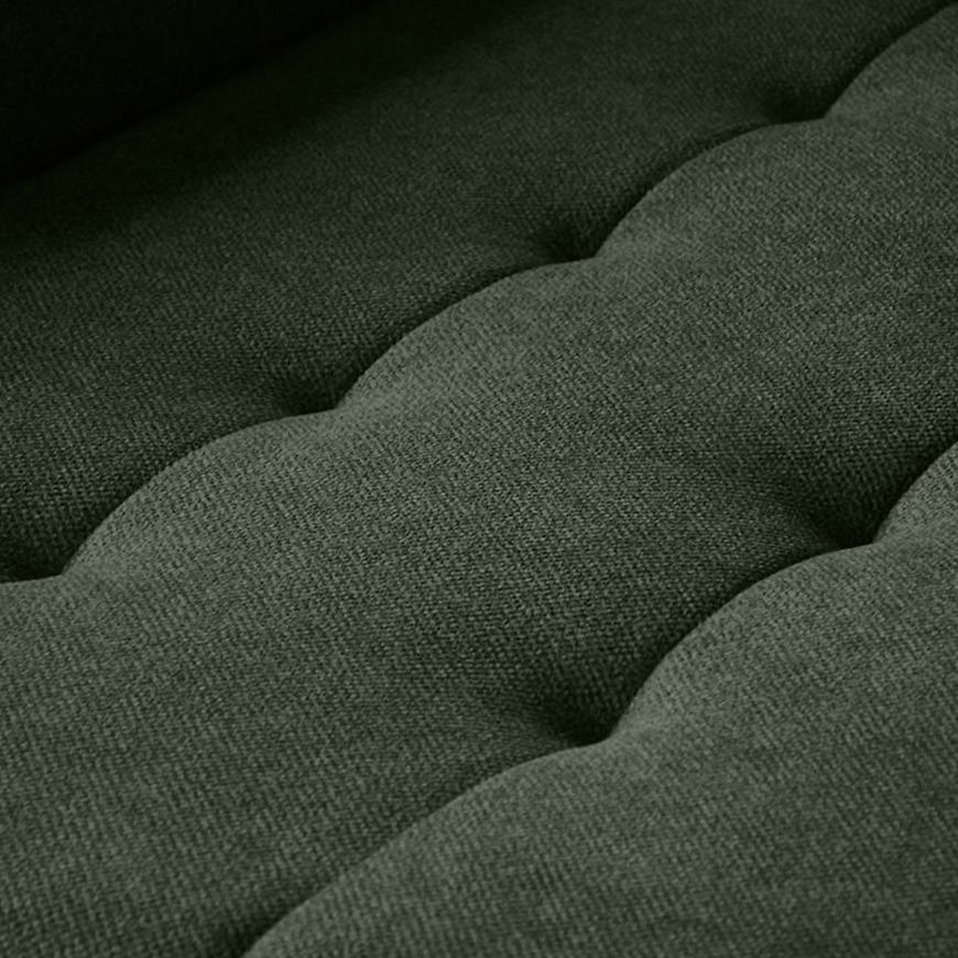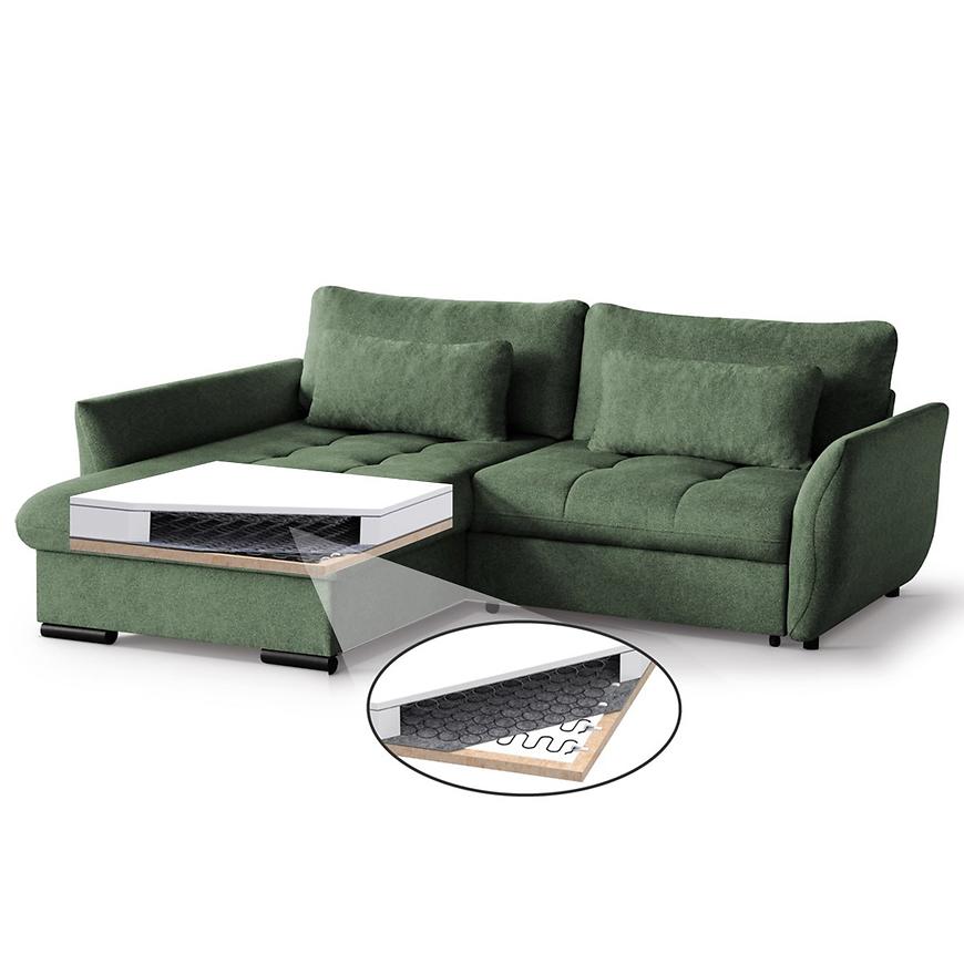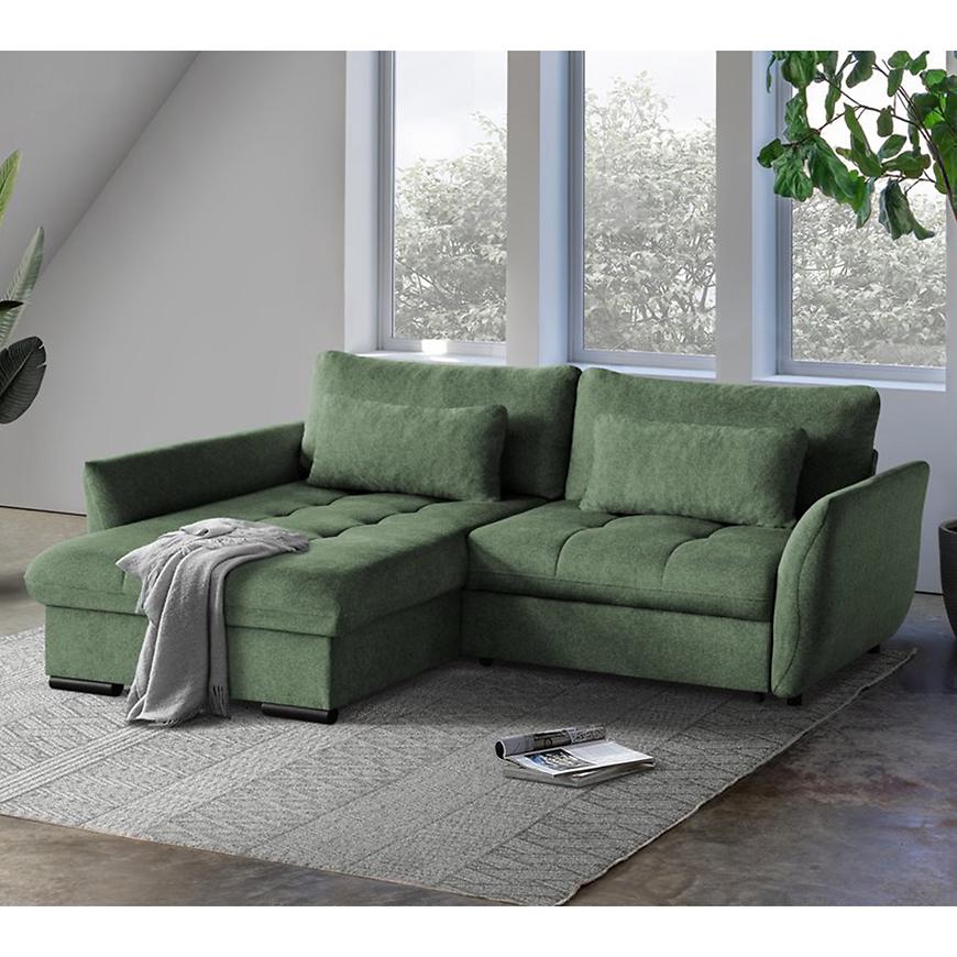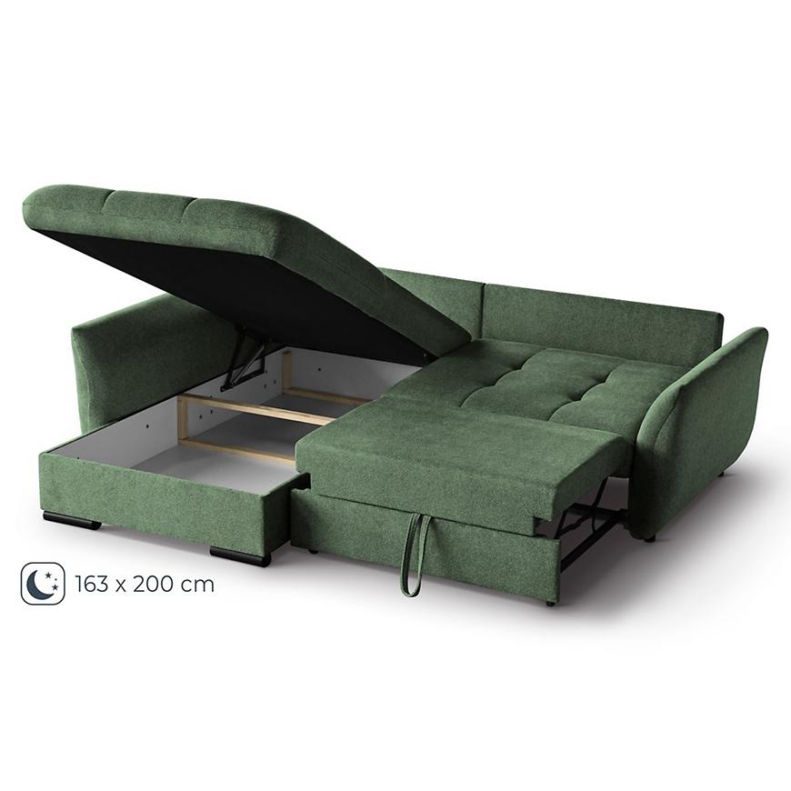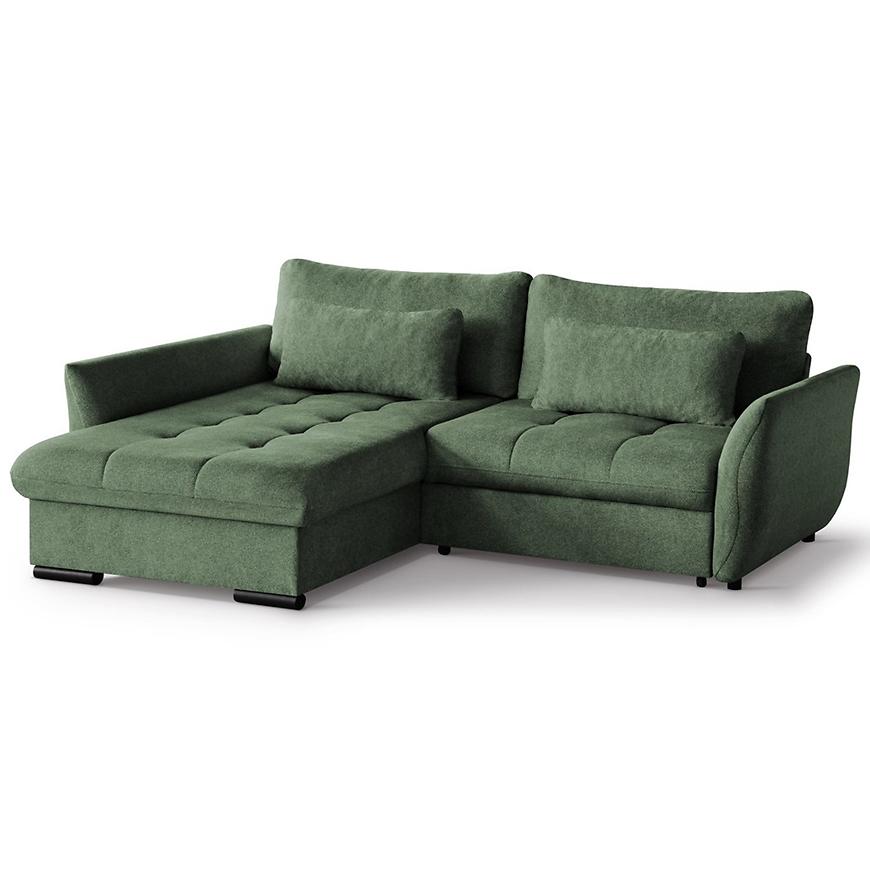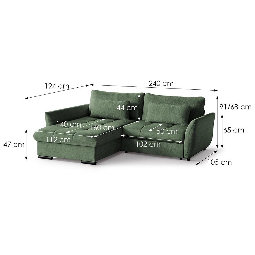 Narożnik Cafu L Louis 672 w zielonym kolorze to nowoczesny narożnik lewostronny w kształcie litery L o wymiarach 240x194 cm. Posiada funkcję spania z powierzchnią 200x163 cm oraz mechanizm rozkładania typu „delfin” z automatem do rozkładania. Siedzisko wypełnione jest sprężyną bonell i sprężyną falistą, jego wysokość wynosi 47 cm, a głębokość 70 cm. Narożnik wyposażony jest w jeden pojemnik na pościel, stoi na czarnych nogach, posiada ozdobne przeszycia i w zestawie poduszki. Wymaga montażu, nie zawiera pufy, a zagłówki, podłokietniki i oparcie nie są regulowane.
