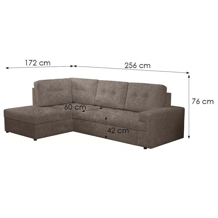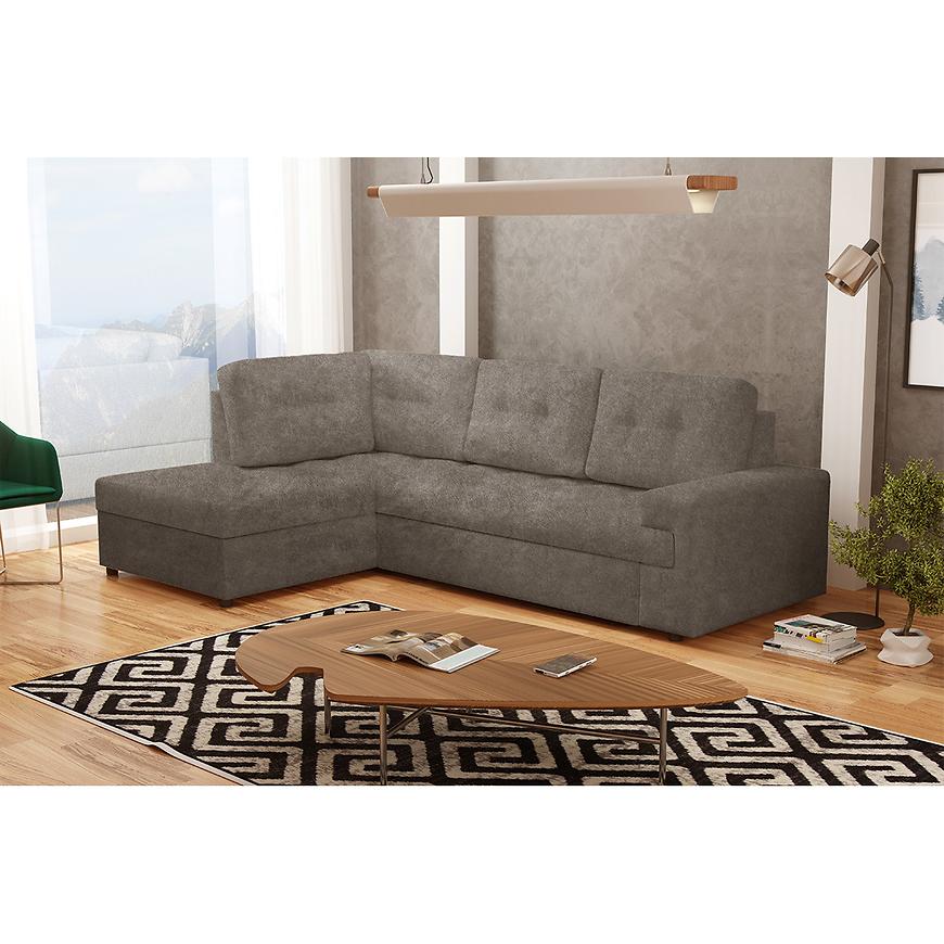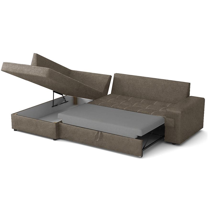 Narożnik Castello L Sally 3 to duży, klasyczny narożnik w kształcie litery L, w kolorze brązowym z lewą orientacją. Tapicerowany trwałą tkaniną, posiada sprężyny faliste zapewniające komfort siedzenia i spania. Wyposażony w funkcję spania typu delfin oraz jeden pojemnik na pościel. Wymiary: 256×172 cm, powierzchnia spania: 215×150 cm. Posiada czarne nogi, poduszki w zestawie i wymaga złożenia. Idealny do eleganckiego salonu.