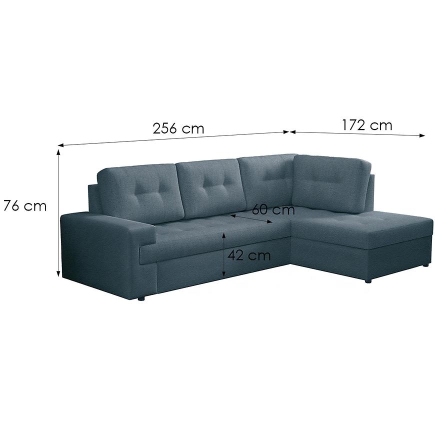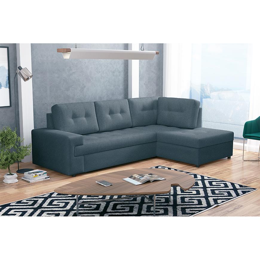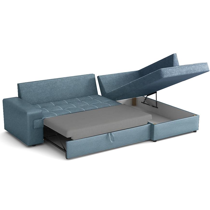 Narożnik Castello P Sally 5 to klasyczny narożnik w kształcie litery L, idealny do salonu. Tapicerowany niebieską tkaniną, z wygodnym siedziskiem na sprężynie falistej. Wyposażony w funkcję spania z rozkładaniem typu delfin oraz pojemnik na pościel. W zestawie poduszki, stabilność zapewniają czarne nogi. Wymiary 256x172 cm, powierzchnia spania 215x150 cm. Wymaga samodzielnego montażu.