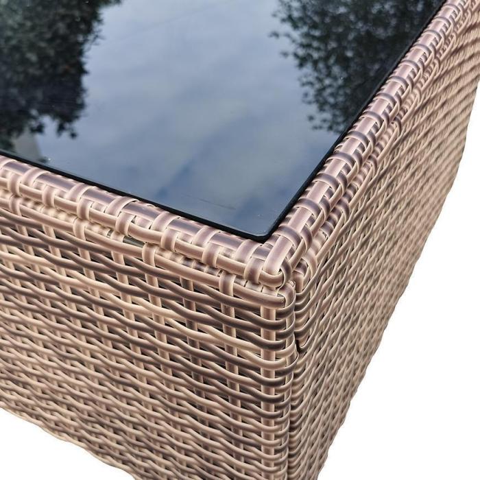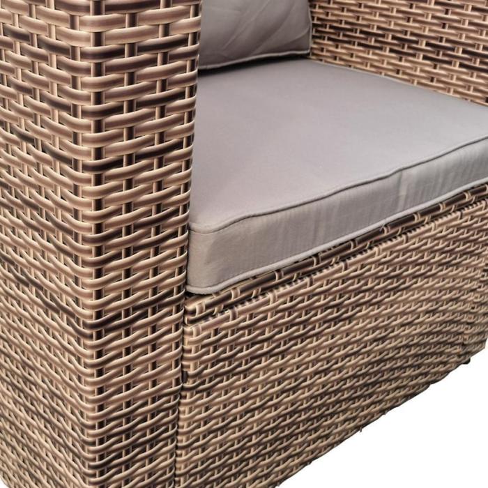 Komplet mebli technorattanowych to idealne rozwiązanie do każdego ogrodu czy na taras gdzie z przyjemnością spędzisz wszystkie letnie popołudnia i weekendy wraz ze znajomymi czy rodziną. Komplet składa się z 4 elementów wraz z poduszkami. Blat stolika jest wytrzymały, wykonany bowiem ze szkła hartowanego, konstrukcja z kolei jest metalowa.