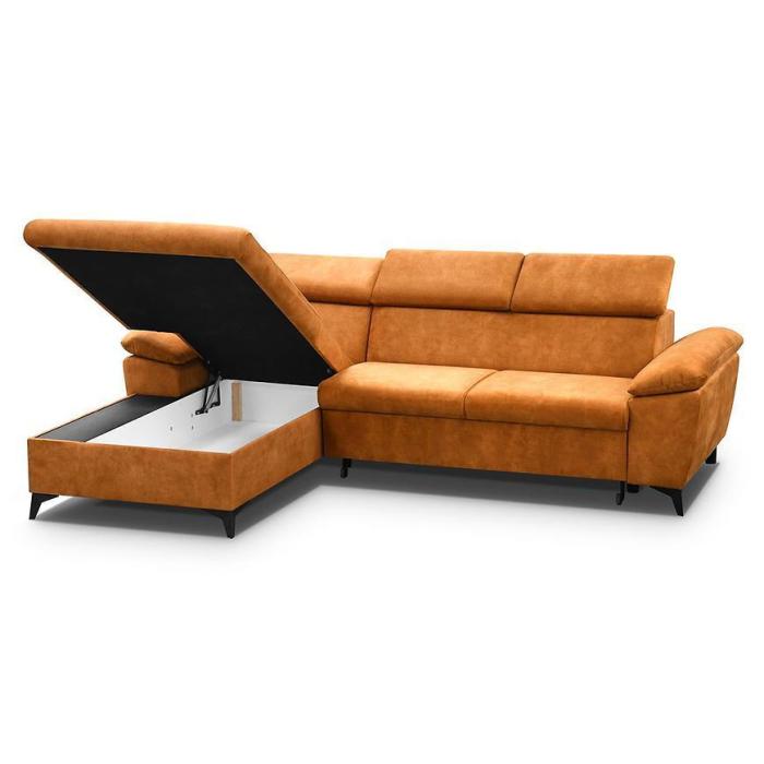 Narożnik Colin z funkcją spania został pokryty tkaniną. Prostotę i łatwość użytkowania gwarantuje system rozkładania typu delfin. Jest to szybki, prosty i wygodny sposób rozkładania. Jest jednym z najbardziej popularnych systemów rozkładania, który jest wykorzystywany w narożnikach. Po rozłożeniu to okazjonalne miejsce do spania o wymiarach 126x210 cm. Mebel posiada pojemnik, do którego można schować pościel, dodatkowe koce czy też poduszki. W siedzisku zastosowano sprężynę falistą, która dostosowuje się do ciężaru i kształtu ciała, zapewniając tym samym wysoki komfort siedzenia. Ten niepowtarzalny mebel wypoczynkowy stworzono z myślą o funkcjonalności i eleganckim wyglądzie. Narożnik dostępny w wersji prawostronnej i lewostronnej.