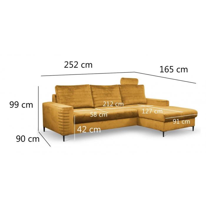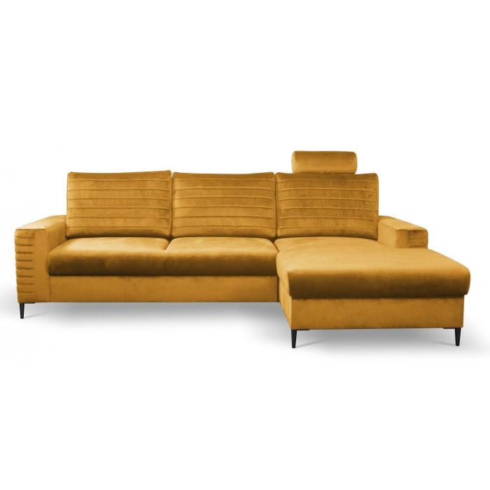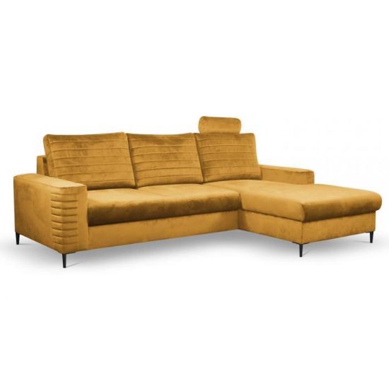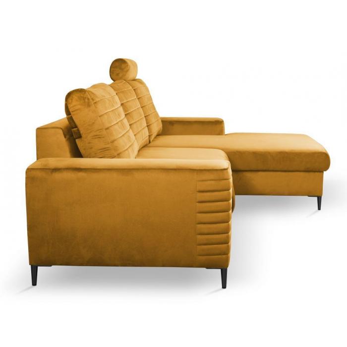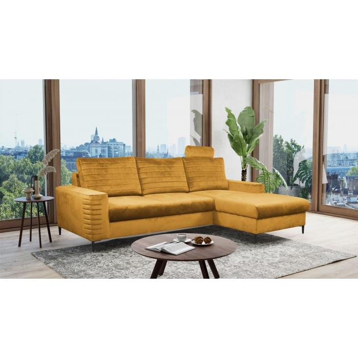 Narożnik Collin w wersji lewej to designerski mebel wypoczynkowy, to doskonały wybór wyposażenia nowoczesnego pokoju dziennego lub salonu - takiego, w którym liczy się przede wszystkim oryginalność. Modny musztardowy kolor narożnika nada pomieszczeniu wyrazistego charakteru. Narożni wykonany jest w przyjemnej w dotyku tkaniny Velutto, lekko połyskująca tkanina z gatunku velvet jest atrakcyjna wizualnie. Mebel wyposażono w trzy poduszki oparciowe oraz zagłówek.