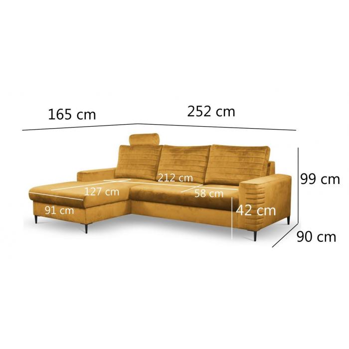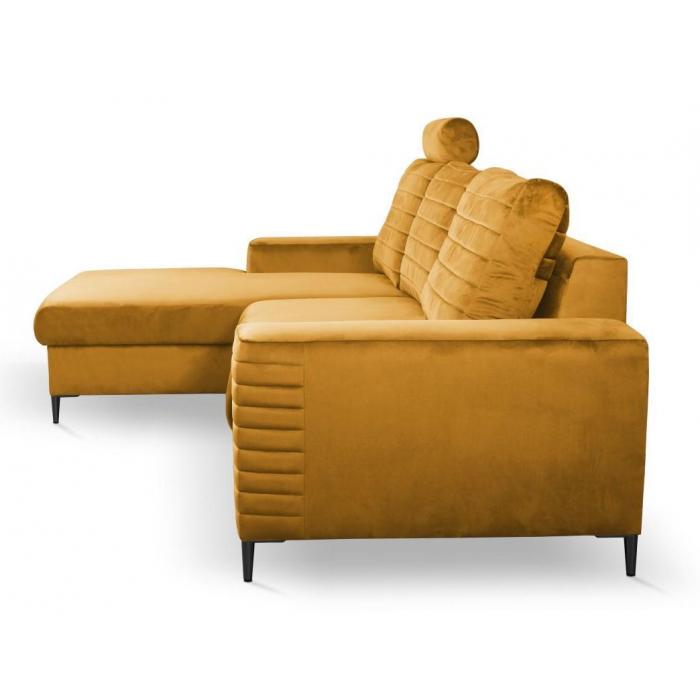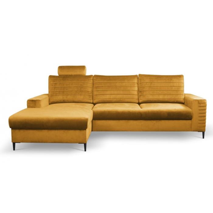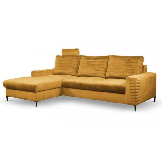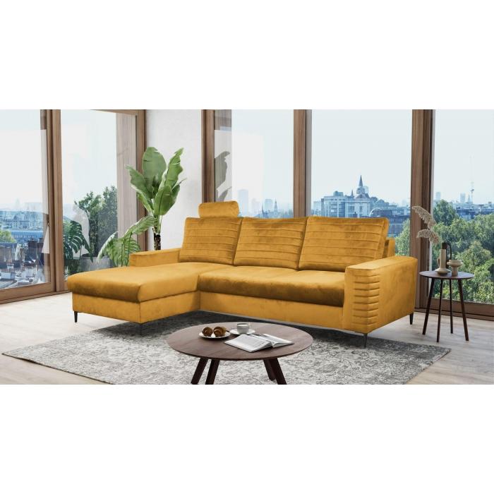 Narożnik Collin w wersji prawej to designerski mebel wypoczynkowy, to doskonały wybór wyposażenia nowoczesnego pokoju dziennego lub salonu - takiego, w którym liczy się przede wszystkim oryginalność. Modny musztardowy kolor narożnika nada pomieszczeniu wyrazistego charakteru. Narożni wykonany jest w przyjemnej w dotyku tkaniny Velutto, lekko połyskująca tkanina z gatunku velvet jest atrakcyjna wizualnie. Mebel wyposażono w trzy poduszki oparciowe oraz zagłówek.