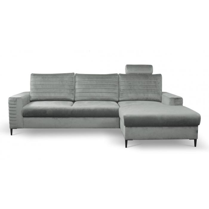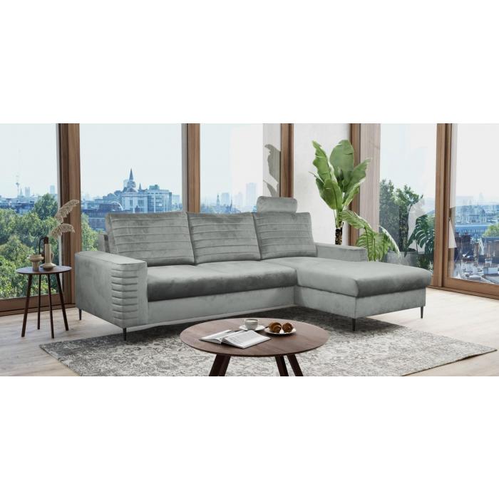 Narożnik Collin w wersji lewej to designerski mebel wypoczynkowy, to doskonały wybór wyposażenia nowoczesnego pokoju dziennego lub salonu - takiego, w którym liczy się przede wszystkim oryginalność. Modny srebrny kolor narożnika nada pomieszczeniu wyrazistego charakteru. Narożnik wykonany jest w przyjemnej w dotyku tkaniny Velutto, lekko połyskująca tkanina z gatunku velvet jest atrakcyjna wizualnie. Mebel wyposażono w trzy poduszki oparciowe oraz zagłówek.