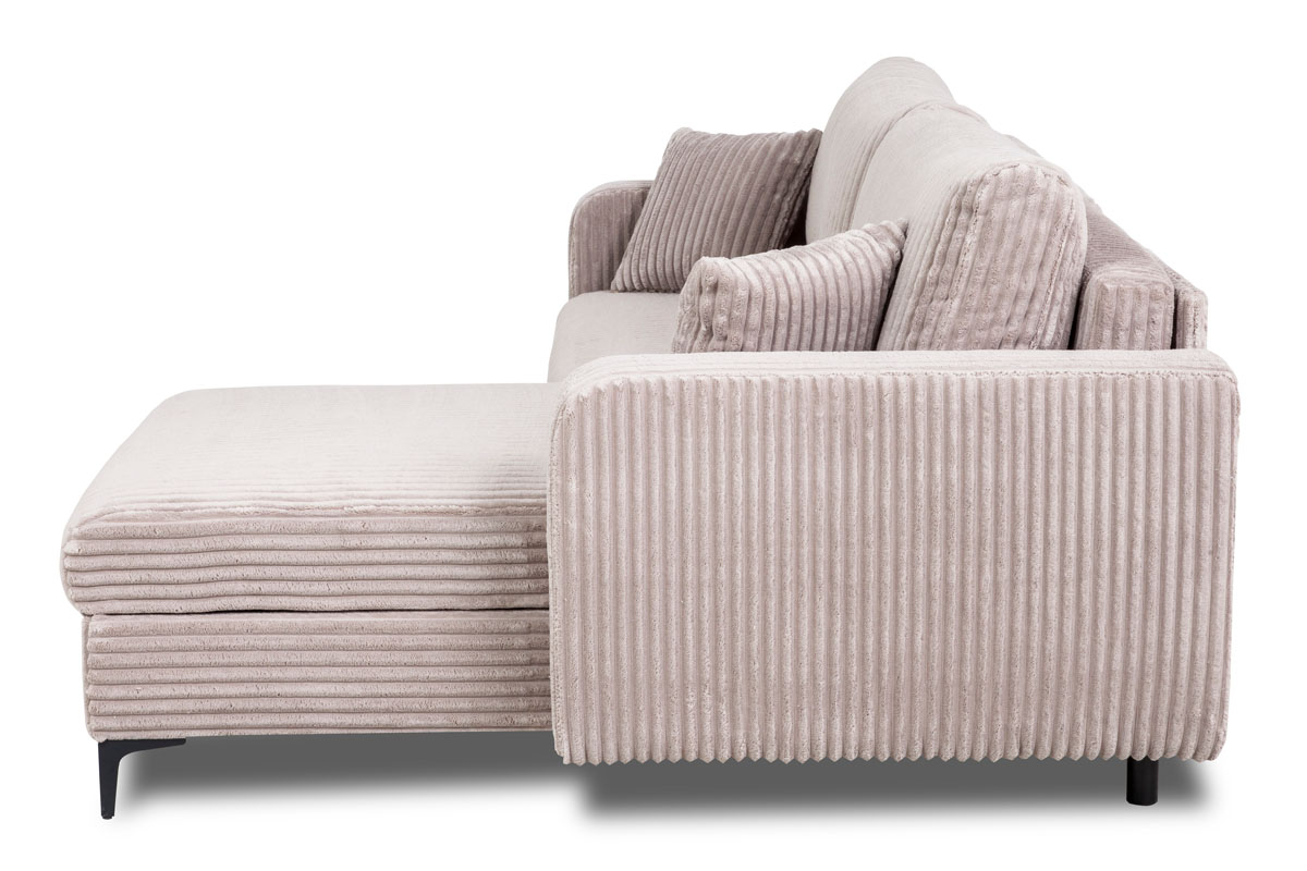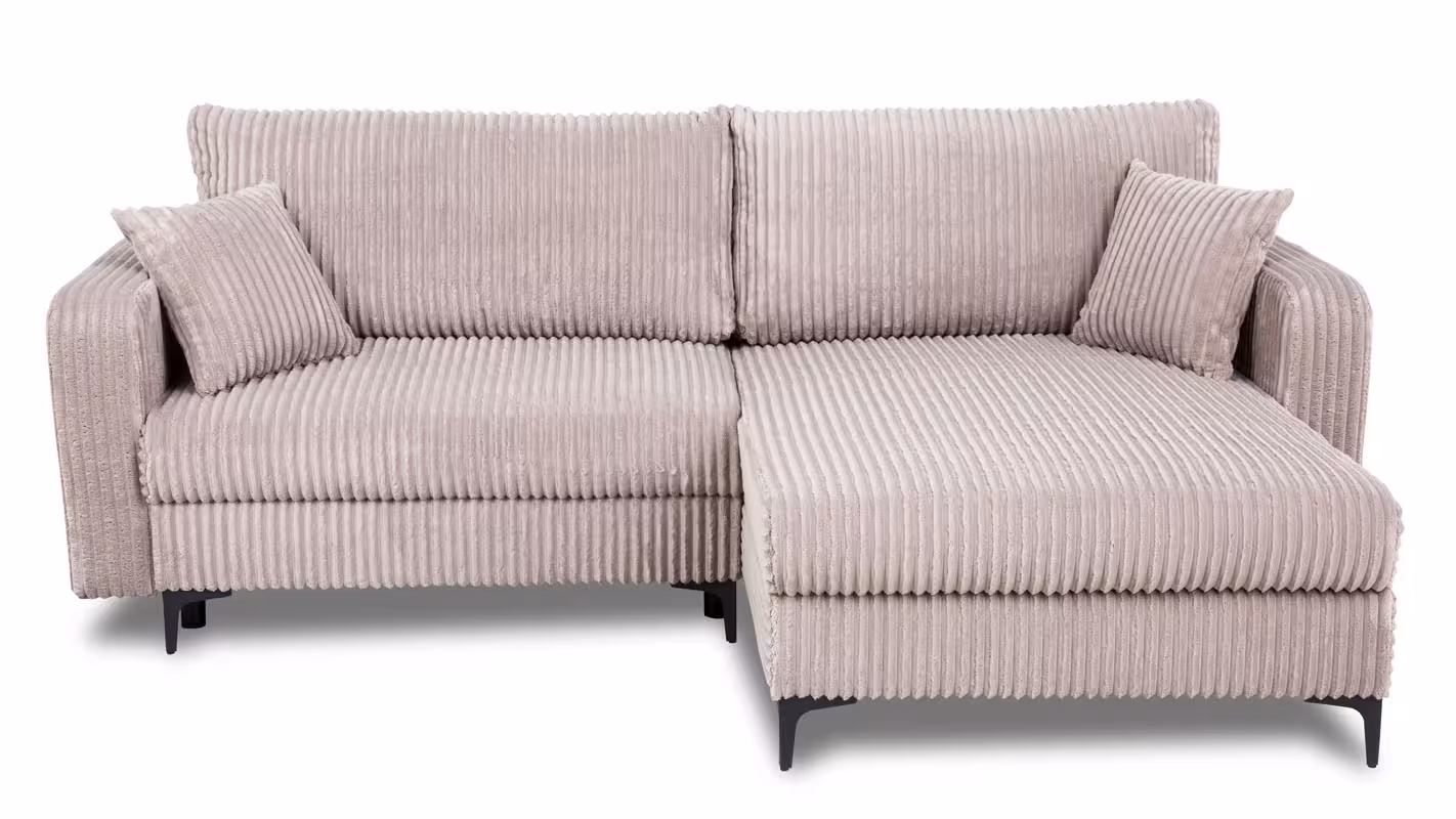 Mebel został obity tkaniną typu sztruks (Hit) w modnym, beżowym kolorze, który wprowadza do aranżacji ciepło i przytulność. Charakterystyczne, prążkowane wykończenie materiału nie tylko nadaje narożnikowi przyjemną strukturę, ale również świetnie komponuje się z innymi tekstyliami. W zestawie znajdują się dwie duże poduszki oparciowe oraz dwie mniejsze dekoracyjne, co dodatkowo podnosi walory estetyczne i użytkowe mebla.