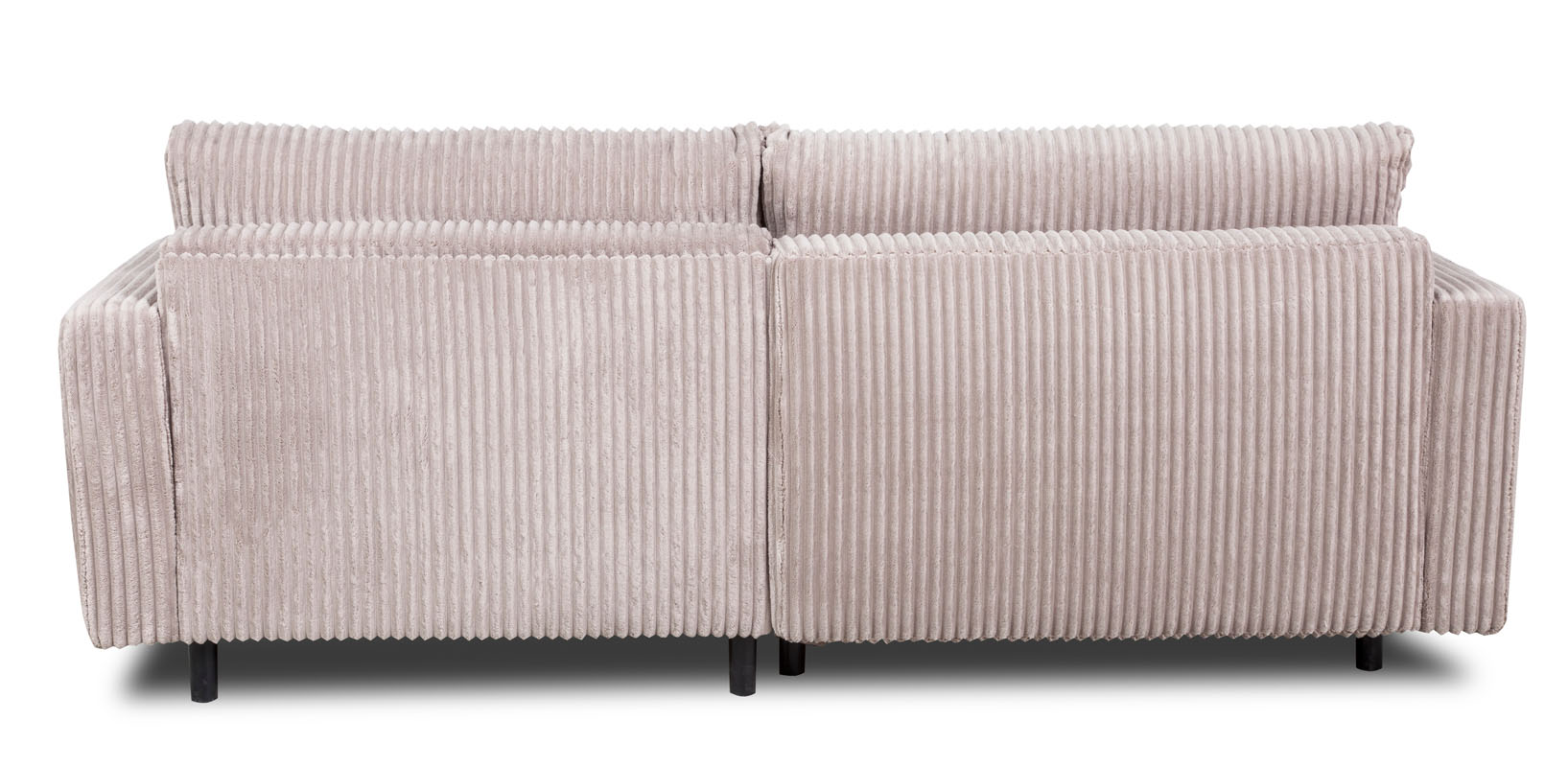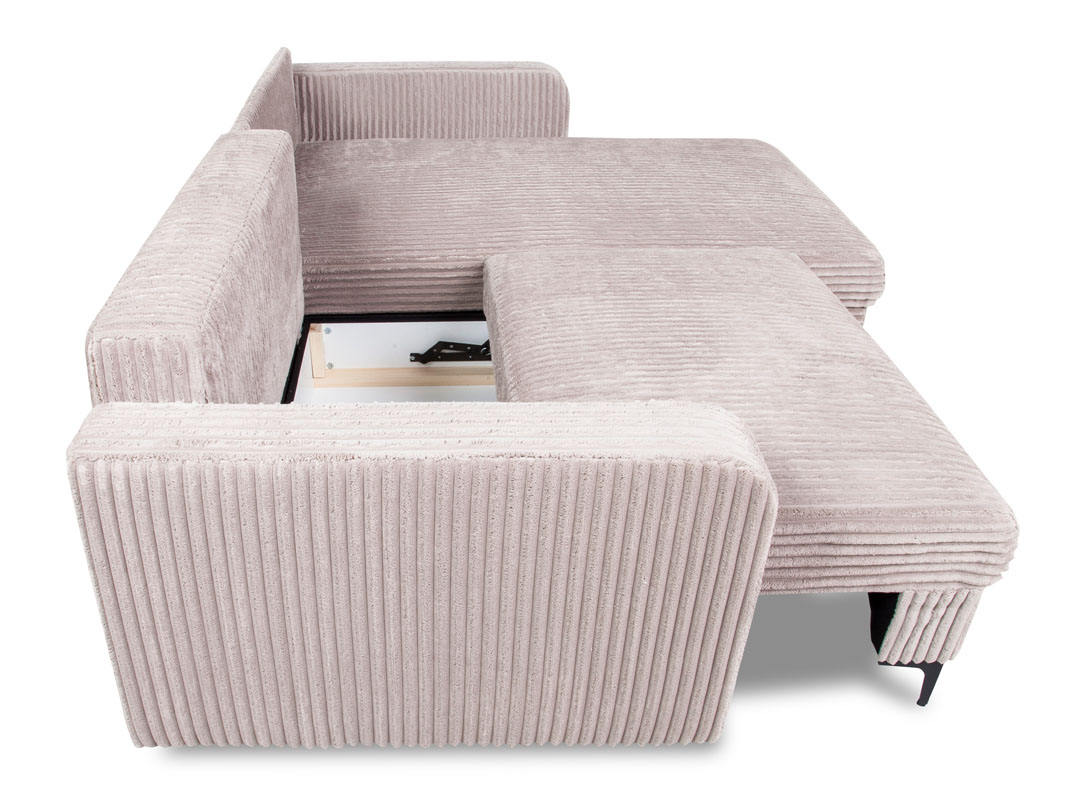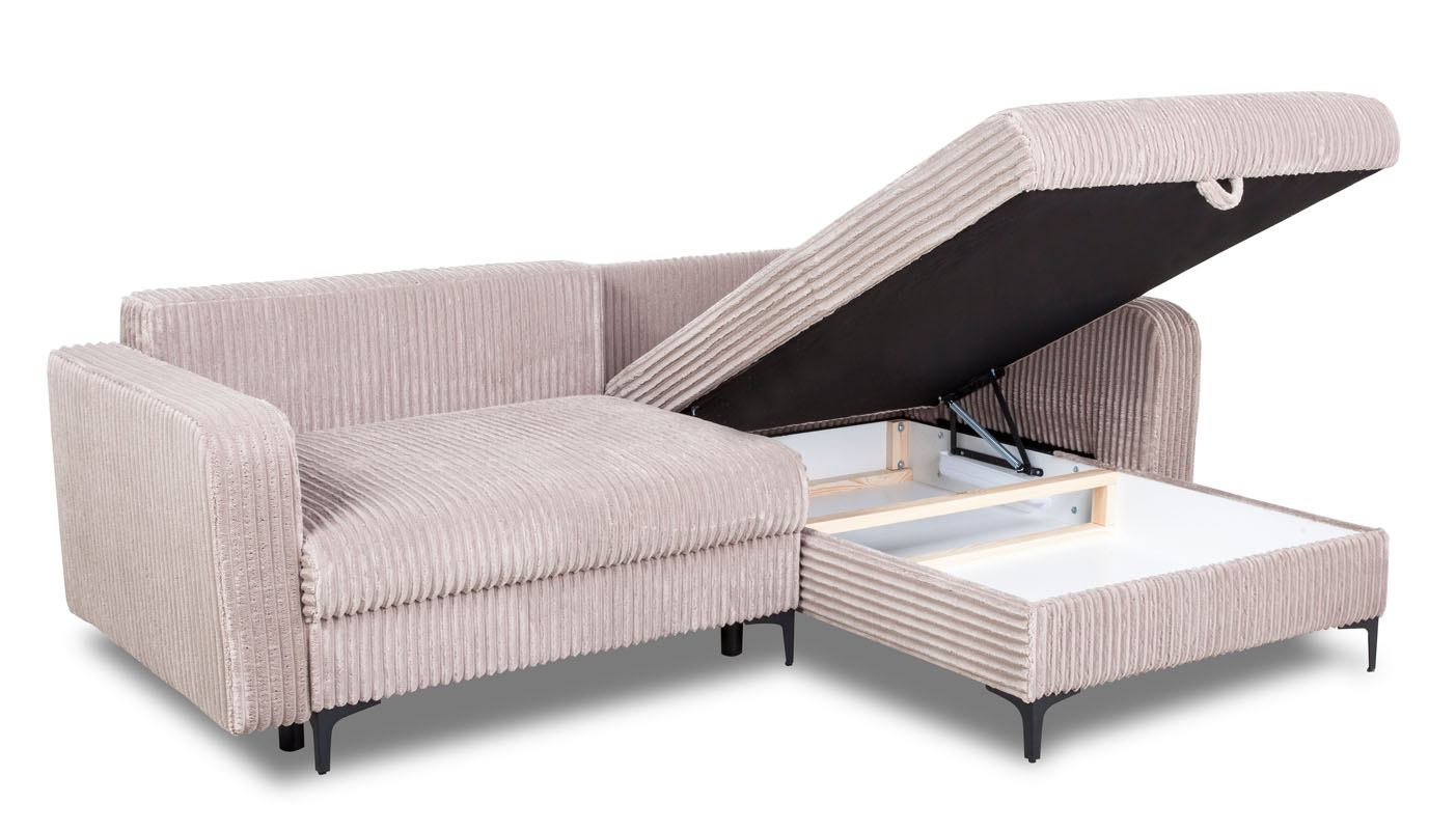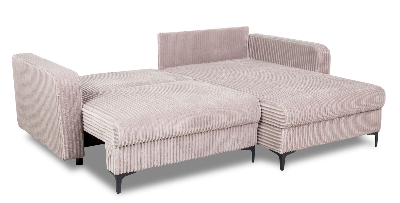 Funkcja spania oparta na mechanizmie DL sprawia, że rozkładanie narożnika jest szybkie i bezproblemowe. Po rozłożeniu uzyskujemy wygodną powierzchnię do spania o wymiarach 150 × 210 cm, co z powodzeniem zastąpi klasyczne łóżko dla gości. Dwa praktyczne pojemniki na pościel umożliwiają przechowywanie kołder, poduszek czy koców, oszczędzając miejsce w szafach.