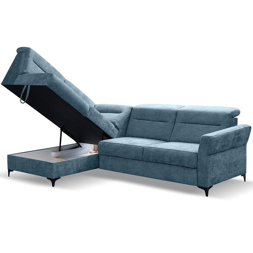 W narożniku znajduje się pojemnik na pościel, który pomieści kołdry, poduszki i pościel, co pozwala utrzymać porządek w salonie. Jeden duży schowek zapewnia wystarczającą przestrzeń do przechowywania niezbędnych rzeczy, dzięki czemu mebel łączy w sobie funkcję wypoczynkową i praktyczną.