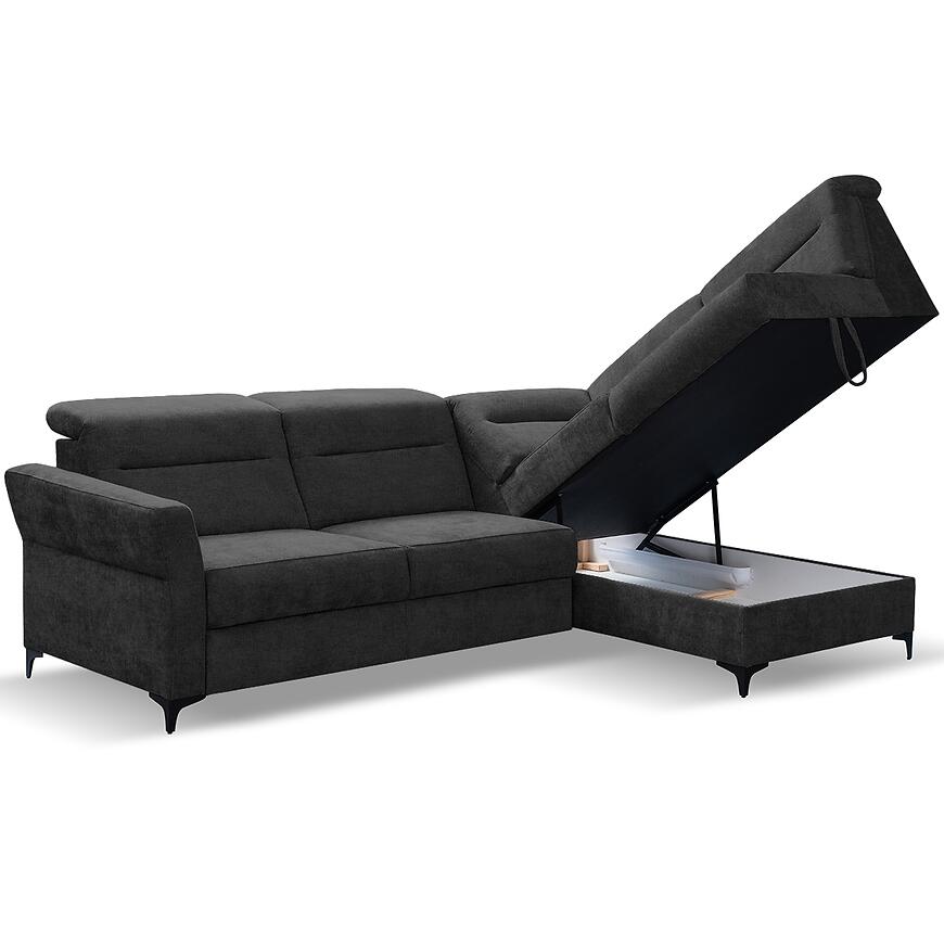 W narożniku znajduje się pojemnik na pościel, który pomieści kołdry, poduszki i pościel, co pozwala utrzymać porządek w salonie. Jeden duży schowek zapewnia wystarczającą przestrzeń do przechowywania niezbędnych rzeczy, dzięki czemu mebel łączy w sobie funkcję wypoczynkową i praktyczną.