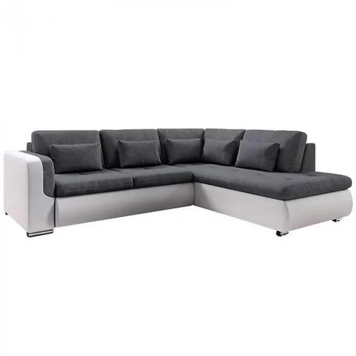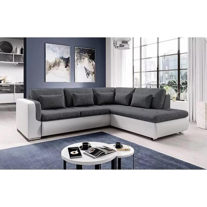 Kanapa narożna Fado tapicerowana jest tkaniną wykonaną z tworzywa sztucznego i ekoskórą. Oparcie oraz siedzisko wypełnione są wygodną sprężyną falistą, która zapewnia komfortowy wypoczynek. Dodatkowe elementy ozdobne, które stanowią poduszki oparciowe nadadzą przytulnego charakteru w Twoim salonie.