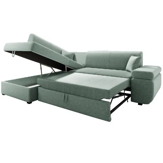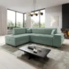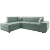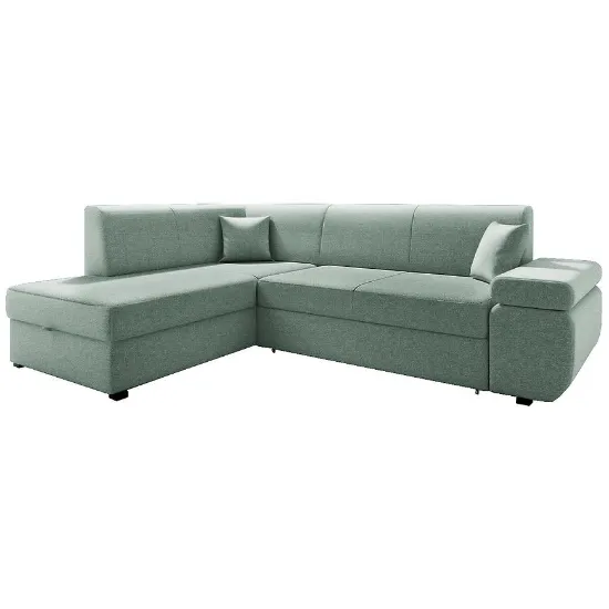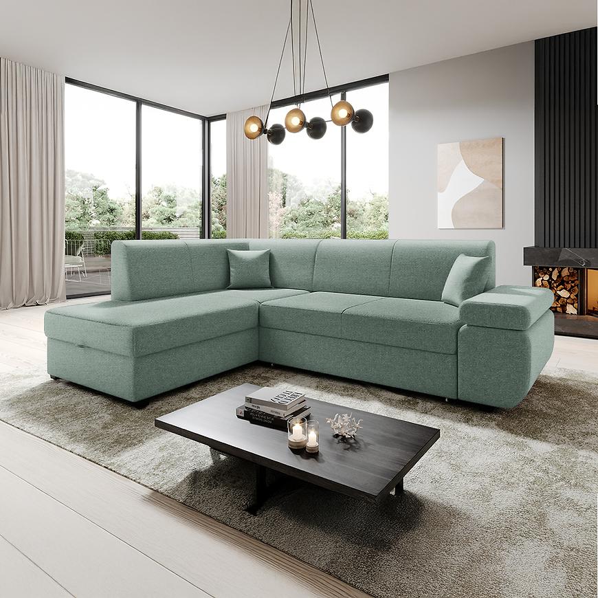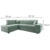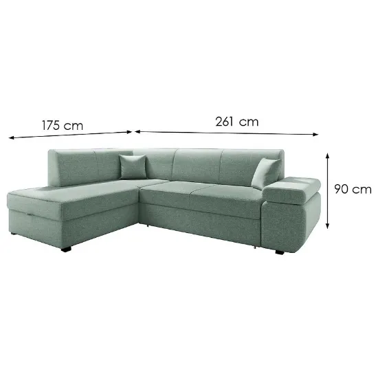 Narożnik w kształcie litery L w wersji lewostronnej idealnie sprawdzi się w większych salonach, oferując sporo przestrzeni do siedzenia. Dodatkowym atutem jest funkcja spania okazjonalnego z powierzchnią 128x196 cm, co pozwala w szybki sposób przekształcić mebel w wygodne miejsce do odpoczynku nocnego. Wbudowany pojemnik na pościel ułatwia przechowywanie kołder i poduszek, pomagając utrzymać porządek w pomieszczeniu. Drewniane nogi podkreślają solidne wykonanie i dodają meblowi naturalnego uroku. W komplecie znajdują się poduszki, które zwiększają komfort i dopełniają stylową całość.