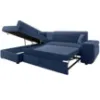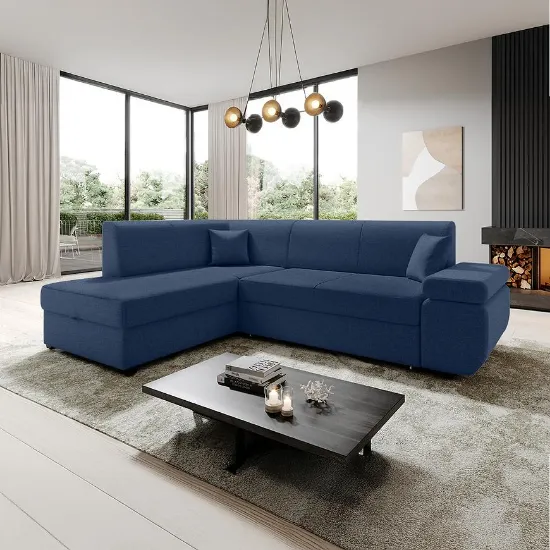 Narożnik w kształcie litery L w wersji lewostronnej idealnie sprawdzi się w większych salonach, oferując sporo przestrzeni do siedzenia. Dodatkowym atutem jest funkcja spania okazjonalnego z powierzchnią 128x196 cm, co pozwala w szybki sposób przekształcić mebel w wygodne miejsce do odpoczynku nocnego. Wbudowany pojemnik na pościel ułatwia przechowywanie kołder i poduszek, pomagając utrzymać porządek w pomieszczeniu. Drewniane nogi podkreślają solidne wykonanie i dodają meblowi naturalnego uroku. W komplecie znajdują się poduszki, które zwiększają komfort i dopełniają stylową całość.