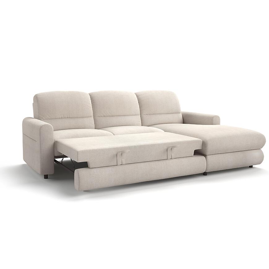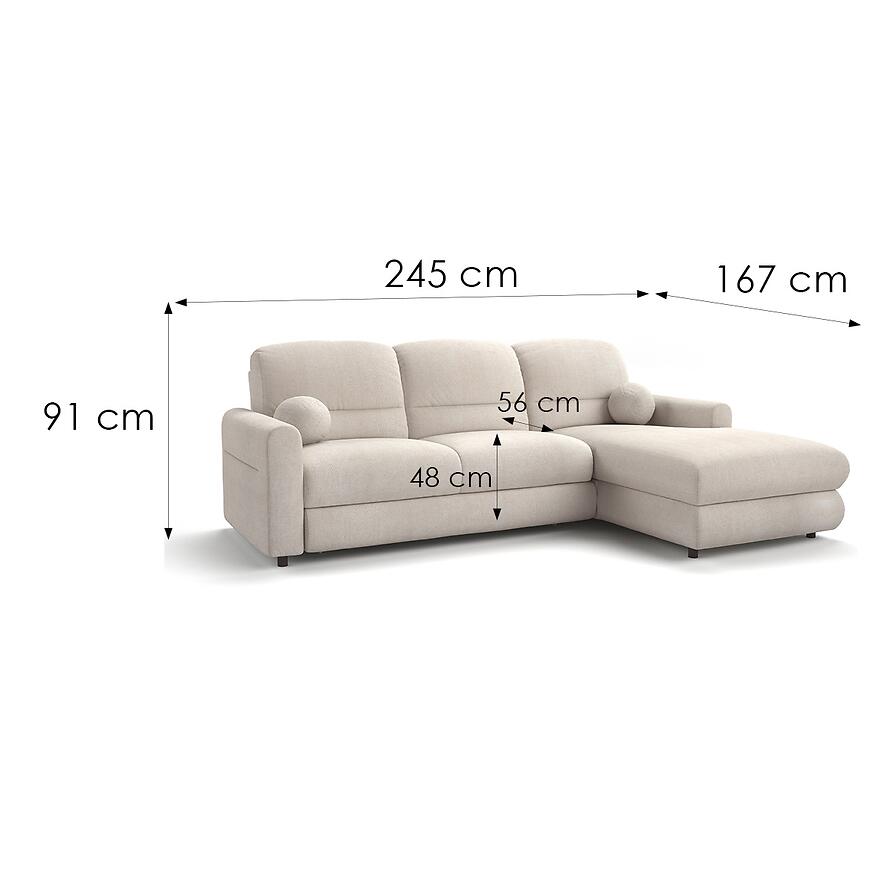 Beżowa tapicerka wykonana z miękkiego szenilu wprowadza do wnętrza przytulny klimat, jednocześnie zachowując nowoczesny wygląd. Mebel został osadzony na czarnych, solidnych nogach, które dodają mu lekkości i podkreślają geometryczną formę. Prawostronna orientacja narożnika ułatwia dopasowanie go do układu pomieszczenia.