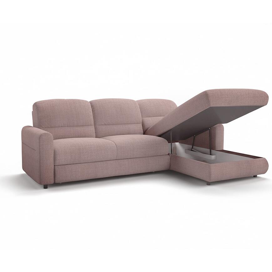 Tapicerka z szenilu w różowym odcieniu jest miękka w dotyku, trwała i łatwa w utrzymaniu czystości. Stabilne czarne nogi nadają meblowi nowoczesny wygląd i zapewniają solidne podparcie. Narożnik nie jest modułowy, co gwarantuje spójną konstrukcję i wysoką stabilność.