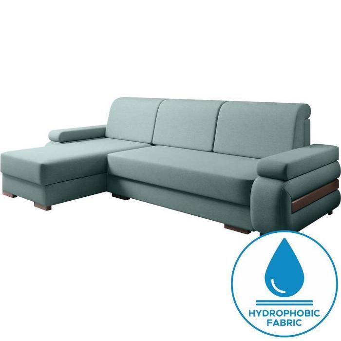 Meble wypoczynkowe Gabi tapicerowane są wysokiej jakości, wytrzymałą tkaniną hydrofobową, którą z łatwością można utrzymać w czystości. To doskonały wybór i najbardziej praktyczny wybór gdy w domu mieszkają dzieci lub zwierzęta. Wypełnienie siedziska stanowi sprężyna bonell, zapewniając wysoki komfort podczas siedzenia. Ozdobne drewniane elementy oraz nóżki, które zapewniają stabilność narożnika, pełnią również funkcję dekoracyjną, przykuwając uwagę.