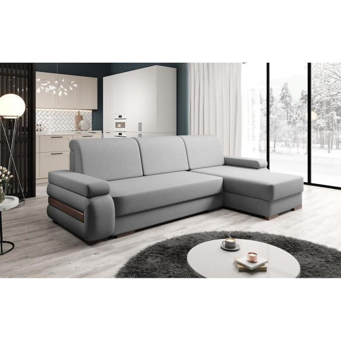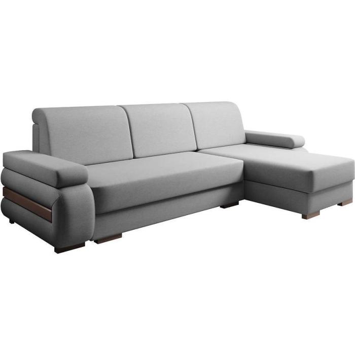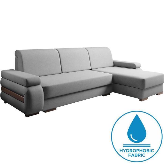 Meble wypoczynkowe Gabi tapicerowane są wysokiej jakości, wytrzymałą tkaniną hydrofobową, którą z łatwością można utrzymać w czystości. To doskonały wybór i najbardziej praktyczny wybór gdy w domu mieszkają dzieci lub zwierzęta. Wypełnienie siedziska stanowi sprężyna bonell, zapewniając wysoki komfort podczas siedzenia. Ozdobne drewniane elementy oraz nóżki, które zapewniają stabilność narożnika, pełnią również funkcję dekoracyjną, przykuwając uwagę.