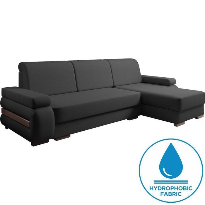 Meble wypoczynkowe Gabi tapicerowane są wysokiej jakości, wytrzymałą tkaniną hydrofobową, którą z łatwością można utrzymać w czystości. To doskonały wybór i najbardziej praktyczny wybór gdy w domu mieszkają dzieci lub zwierzęta. Wypełnienie siedziska stanowi sprężyna bonell, zapewniając wysoki komfort podczas siedzenia. Ozdobne drewniane elementy oraz nóżki, które zapewniają stabilność narożnika, pełnią również funkcję dekoracyjną, przykuwając uwagę.