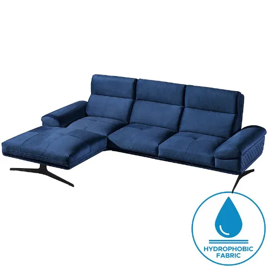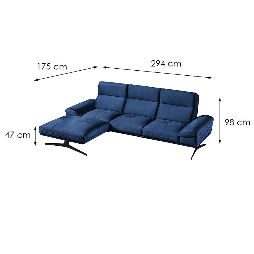 Narożnik Galaxy L Element 13 to nowoczesny narożnik w kształcie L z orientacją lewą. Wymiary 294x175x98 cm i wysokość siedziska 47 cm zapewniają wygodę użytkowania. Tapicerowany w trwałej granatowej tkaninie hydrofobowej, wypełniony sprężyną falistą, z czarnymi nogami, łączy elegancki design z funkcjonalnością, bez funkcji spania i pojemnika na pościel.