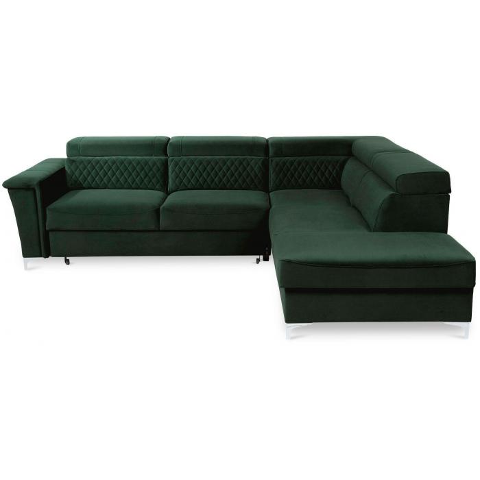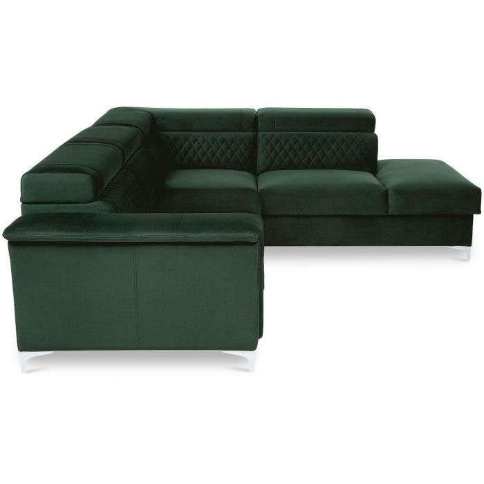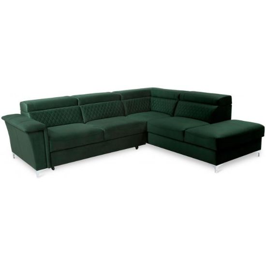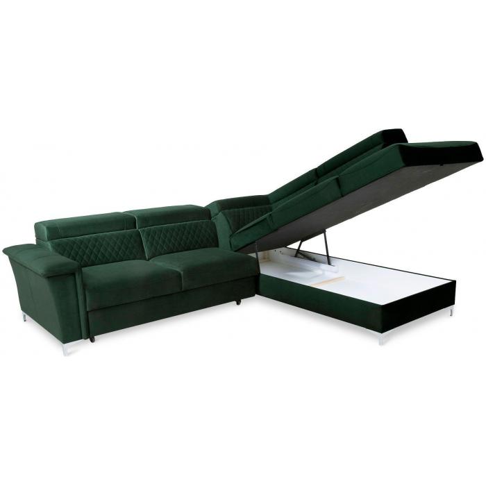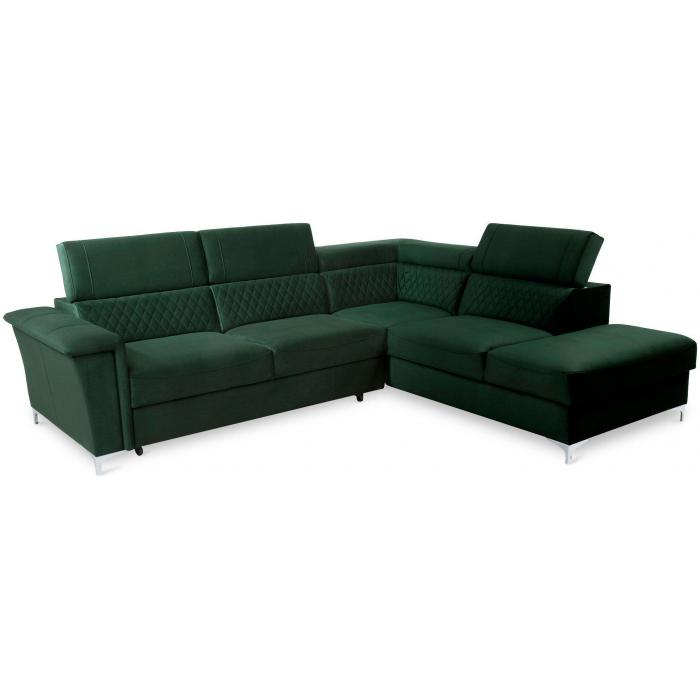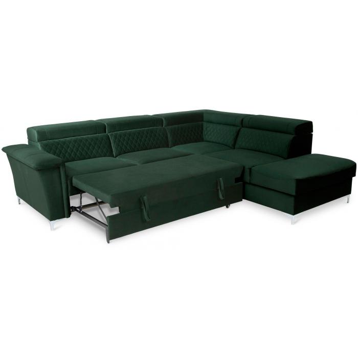 Narożnik Garry w kolorze zielonym z funkcją spania oraz pojemnikiem na pościel. Dostępny w konfiguracji prawej oraz lewej. Sposób rozkładania wózek. Po rozłożeniu otrzymujemy powierzchnię spania o wymiarach 123x203 cm. W siedzisku narożnika zastosowano sprężyna falista + sprężyna bonell. Model posiada regulowane zagłówki zwiększające komfort użytkowania. Jako element dekoracyjny zastosowano srebrne nóżki. Które zapewnią stabilność. Elegancji narożnikowi dodają ozdobne pikowania na oparciu. Narożnik Garry to niepowtarzalny mebel wypoczynkowy stworzono z myślą o funkcjonalności i eleganckim wyglądzie.