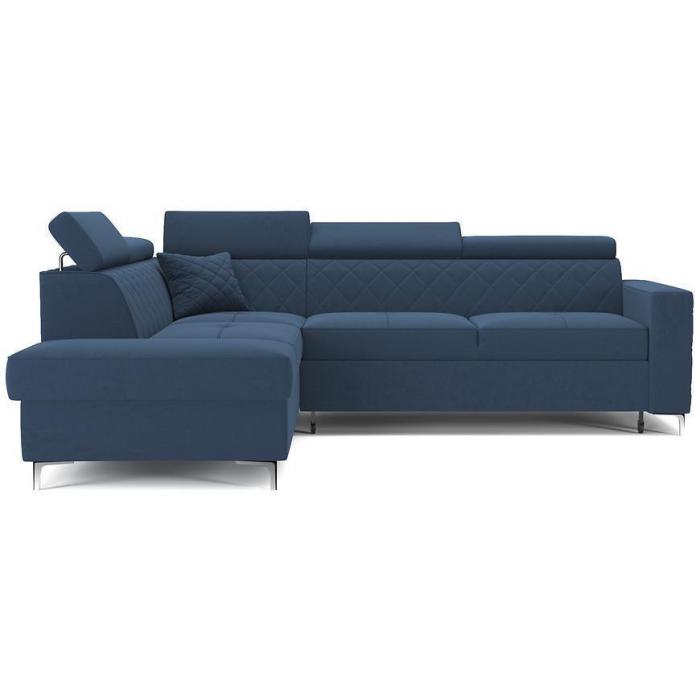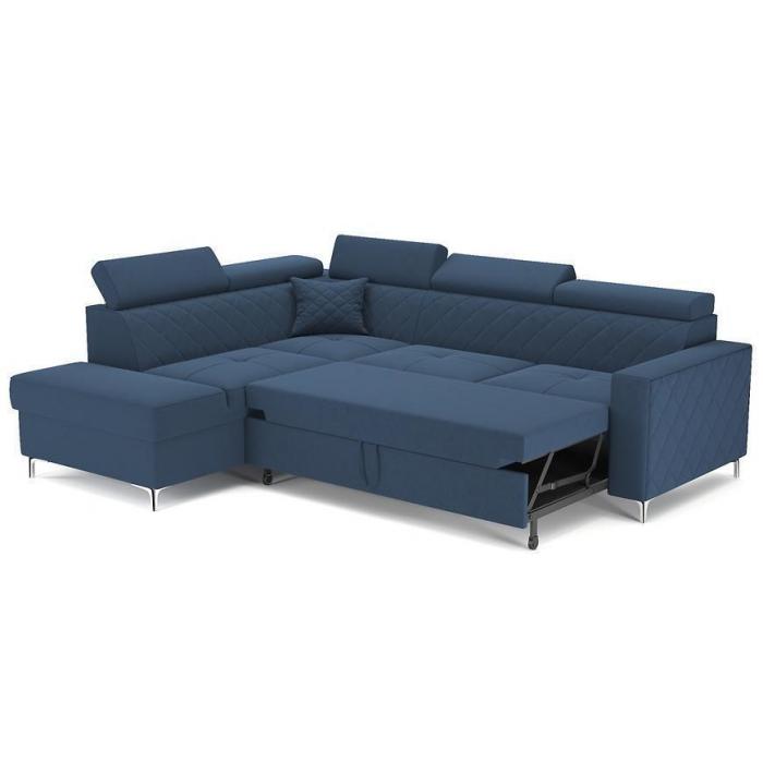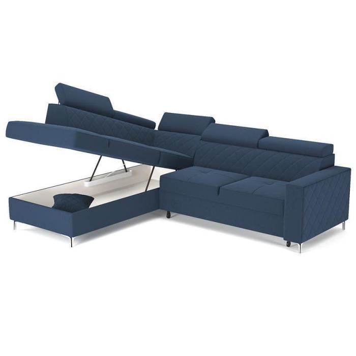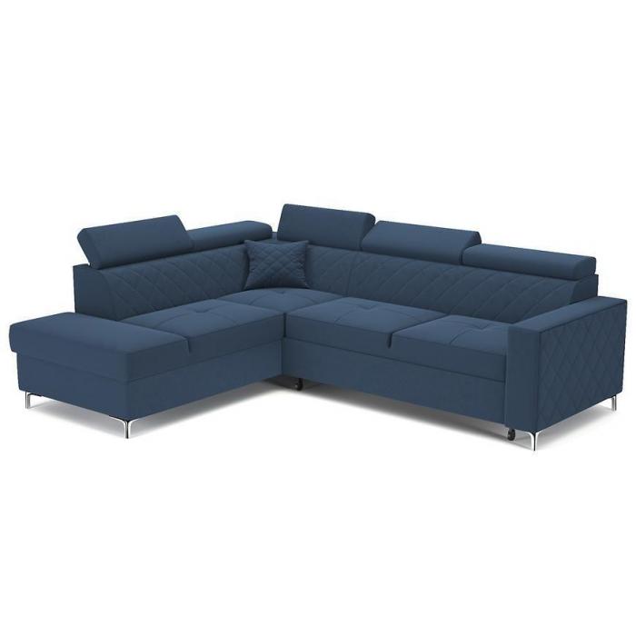 Tapicerka narożnika wykonana jest z tkaniny o intensywnym zabarwieniu. Elegancka i prosta forma oraz kształt litery L sprawiają, że wypoczynek będzie idealnym dopełnieniem wnętrza w stylu nowoczesnym czy też stylu glamour. Lekko profilowane, pikowane oparcie oraz podłokietniki nie tylko stanowią element dekoracyjny, ale poprawiają jakość wypoczynku. Kanapa posiada także regulowane zagłówki.