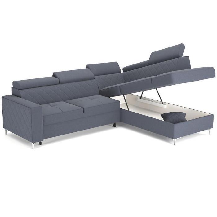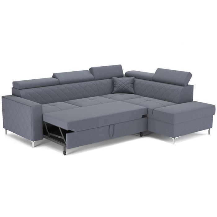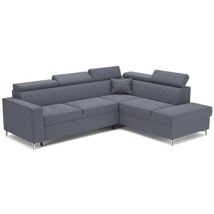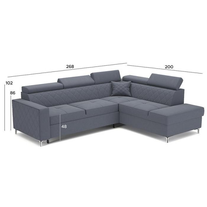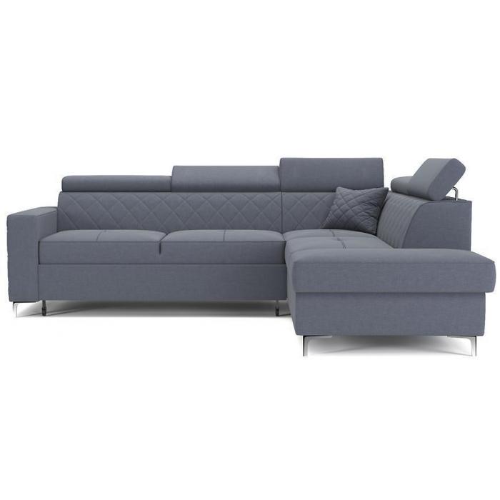 Tapicerka narożnika wykonana jest z tkaniny o intensywnym zabarwieniu. Elegancka i prosta forma oraz kształt litery L sprawiają, że wypoczynek będzie idealnym dopełnieniem wnętrza w stylu nowoczesnym czy też stylu glamour. Lekko profilowane, pikowane oparcie oraz podłokietniki nie tylko stanowią element dekoracyjny, ale poprawiają jakość wypoczynku. Kanapa posiada także regulowane zagłówki.